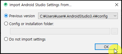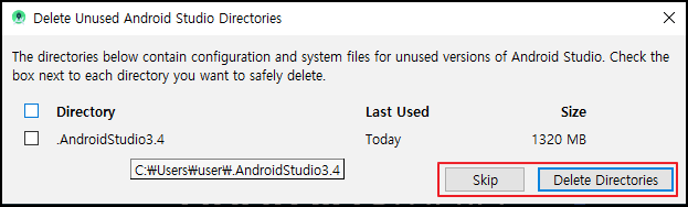 4. 이전에 있던 안드로이드 스튜디오 3.4. 디렉토리를 삭제할 건지 물어봅니다. 혹시 모르니 저는 Skip 하고 진행했습니다.