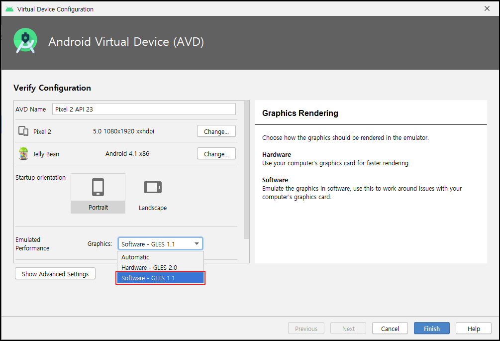 이 방법으로 되지 않은 경우 AMD manager 실행 후 에뮬레이터를 만들 때 Graphics를 Sotfware-GLES 로 변경하고 실행해 봅니다. 보통 Automatic으로 default가 잡혀 있을 겁니다.