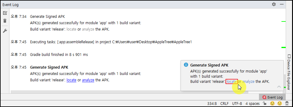 7. 인증서 생성이 끝나면 프로젝트 하단 우측과 Event Log에 Generate Signed APK 팝업창이 뜹니다. 이때 locate 버튼을 누르면 apk 설치 폴더로 이동하게 되고 확인할 수 있습니다.