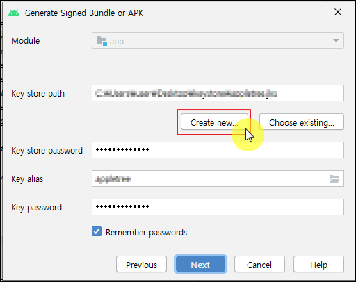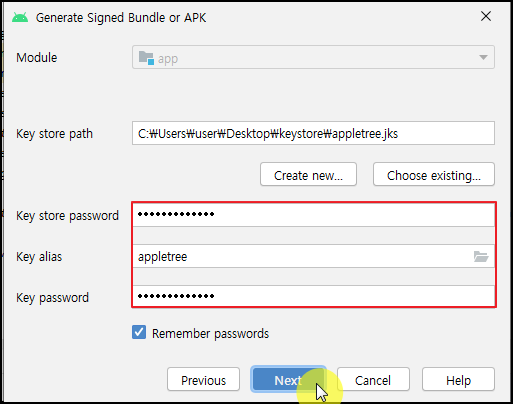 5. 인증서를 생성하면 처음 화면으로 돌아오는데 생성할 때 입력했던 Key store password, Key alias, Key password를 입력하고 Next 버튼을 누릅니다. 저 같은 경우는 비밀번호가 헷갈릴 수 있어 store와 alias 모두 동일하게 했습니다.