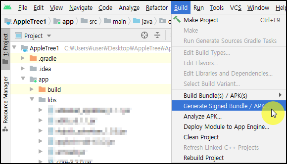 1. 프로젝트를 띄우고 상단 안드로이드 스튜디오 메뉴 Build > Generate Signed Bundle /APK... 를 클릭합니다.