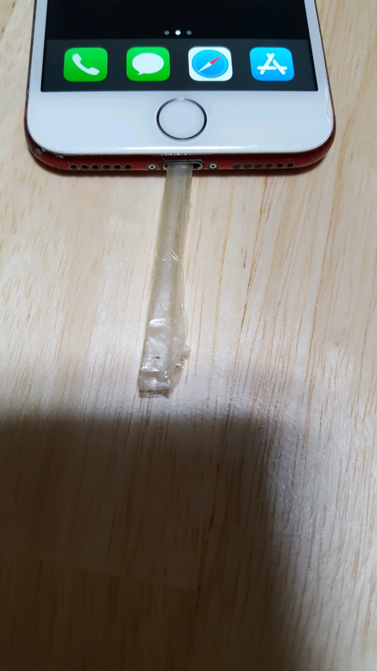 테이프를 적당한 크기로 자른 다음에 충전기 단자에 들어갈 만큼 돌돌 말아서 끝부분을 납작하게 눌러주세요. 그리고 이리저리 돌려서 먼지를 제거해 줍니다. 양 끝으로 다 해주세요.