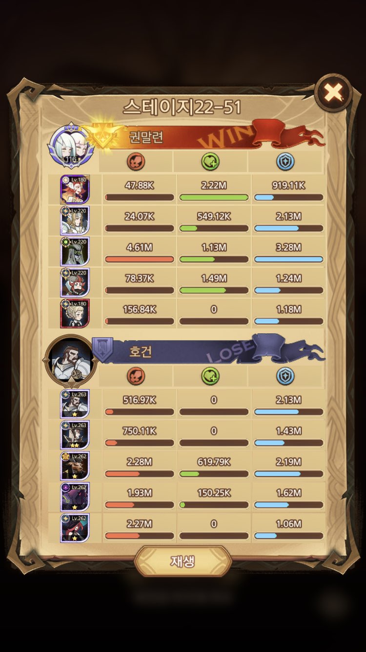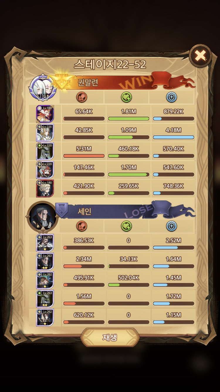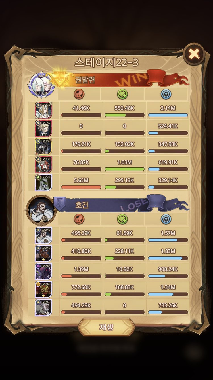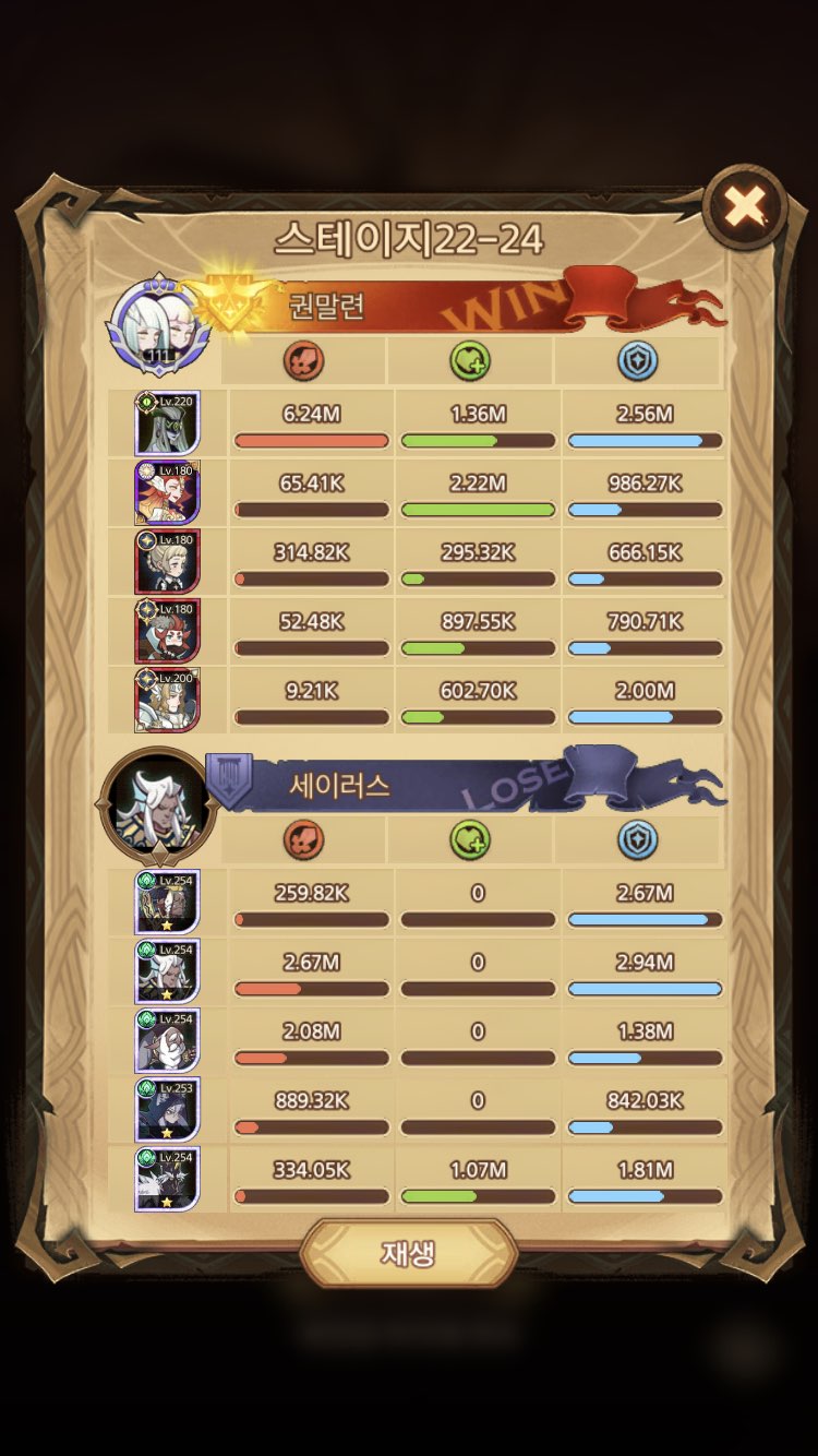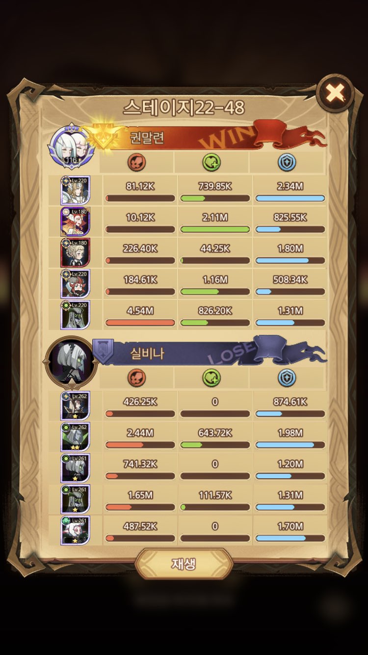 22-32 : 3일을 장기 주차한 챕터입니다. 적 진영이 그레이브본이기 때문에 상성에 불리하기도 하고 까다로운 영웅인 박쥐, 페라엘, 실비나까지 있어서 꽤 어려운 챕터입니다. 생명의 나무도 레벨업 해주고 루시우스와 로완을 신화로 만들고 레벨을 220까지 찍었습니다. 루시우스 궁이 빠르게 돌지 않아서 루시우스한테 호각을 줬습니다. 아티팩트도 참고하세요. 220을 찍어도 힘드네요. 공명 200은 되어야 수월하게 클리어할 것 같습니다.