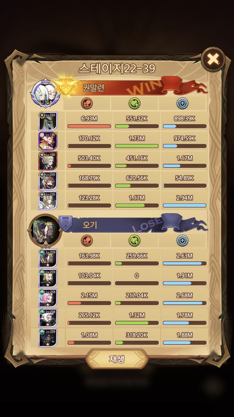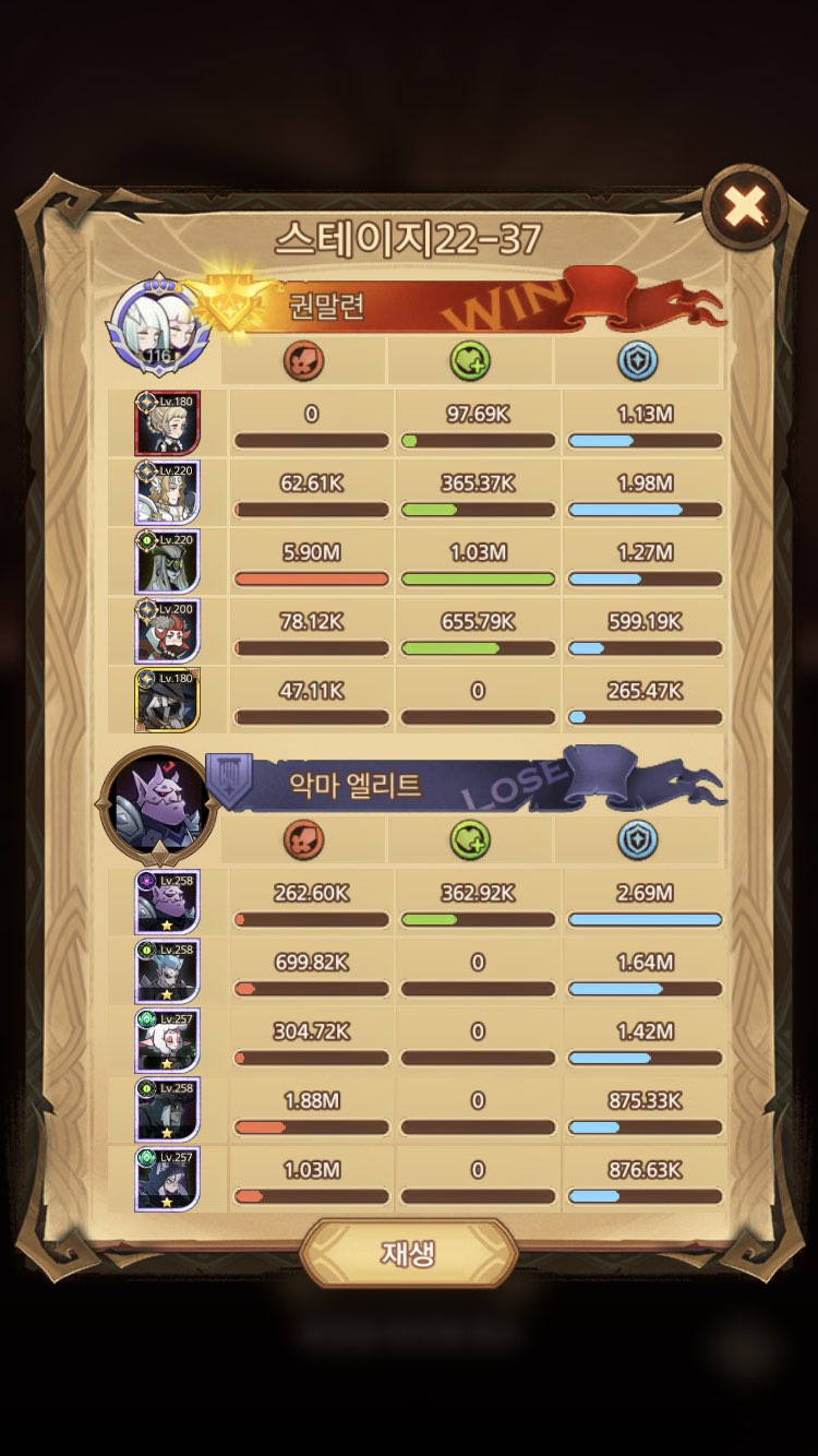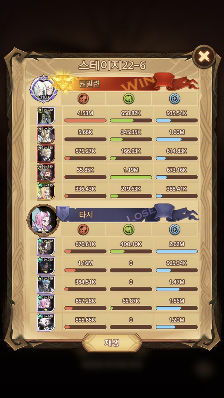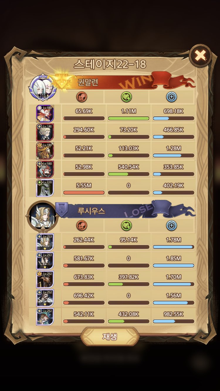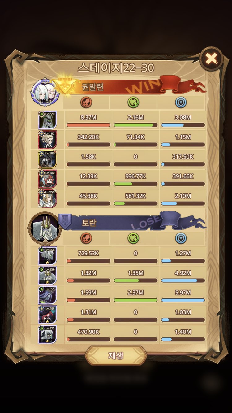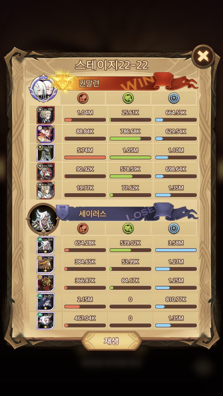 22-32 : 3일을 장기 주차한 챕터입니다. 적 진영이 그레이브본이기 때문에 상성에 불리하기도 하고 까다로운 영웅인 박쥐, 페라엘, 실비나까지 있어서 꽤 어려운 챕터입니다. 생명의 나무도 레벨업 해주고 루시우스와 로완을 신화로 만들고 레벨을 220까지 찍었습니다. 루시우스 궁이 빠르게 돌지 않아서 루시우스한테 호각을 줬습니다. 아티팩트도 참고하세요. 220을 찍어도 힘드네요. 공명 200은 되어야 수월하게 클리어할 것 같습니다.