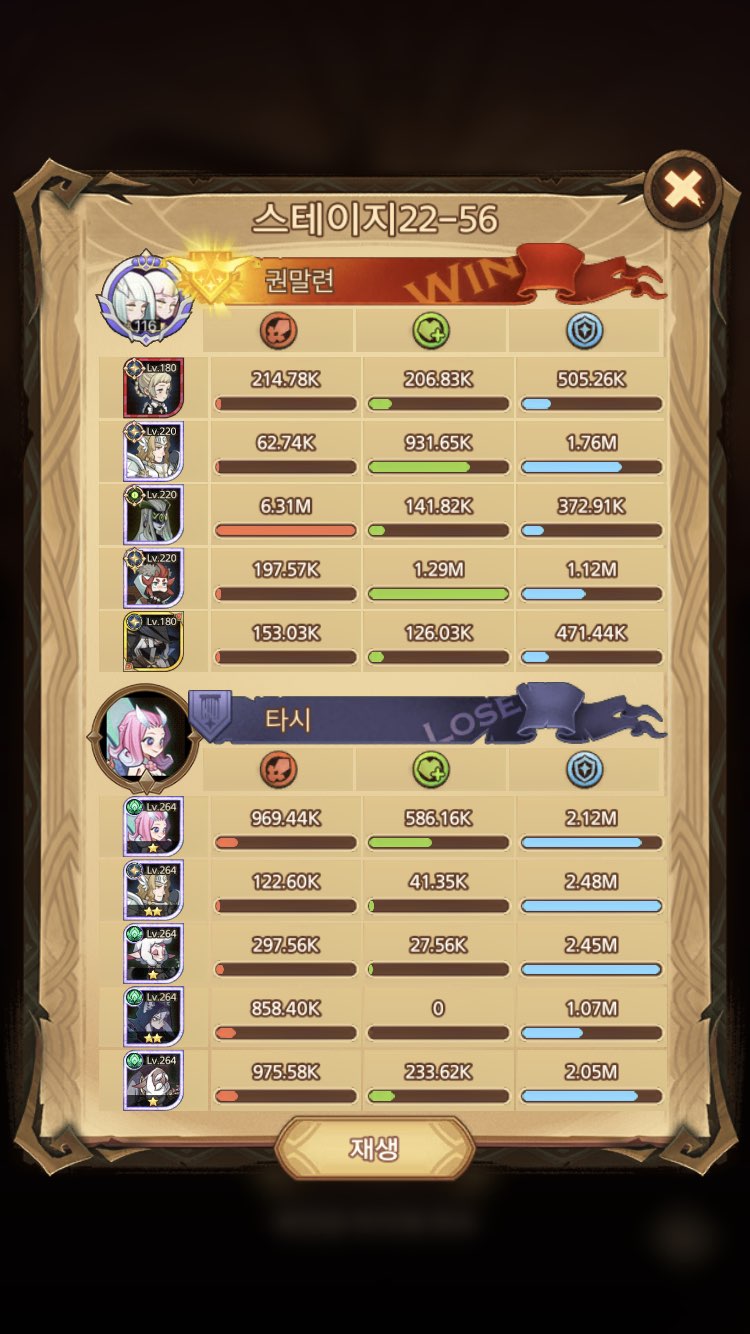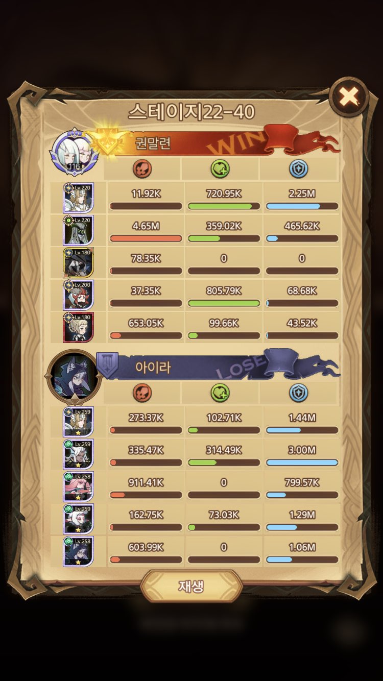 22-44 : 처음으로 상대 진영에 아탈리아가 나옵니다. 아탈리아가 궁을 쓰면 거의 다 전멸하기 때문에 타시를 넣어서 아탈리아를 추방시키고 포크스를 넣어서 상대 포크스를 관짝으로 보내야합니다. 적 포크스가 세미라를 관짝에 보내는데 한번씩 회피가 납니다. 세미라가 관짝을 피했을 때 클리어했습니다. 아탈리아가 궁을 쓰기전에 빠르게 궁을 돌려서 잡아야 합니다. 타시 수면궁과 로완 궁(스턴)으로 아탈리아 딜로스가 생기게 해야 합니다.