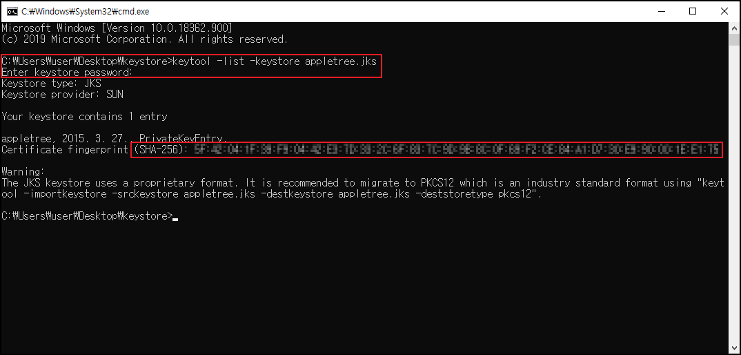 2. keytool -list -keystore 파일명.jks 를 입력합니다. 패스워드는 인증서 비밀번호를 입력하시면 됩니다.