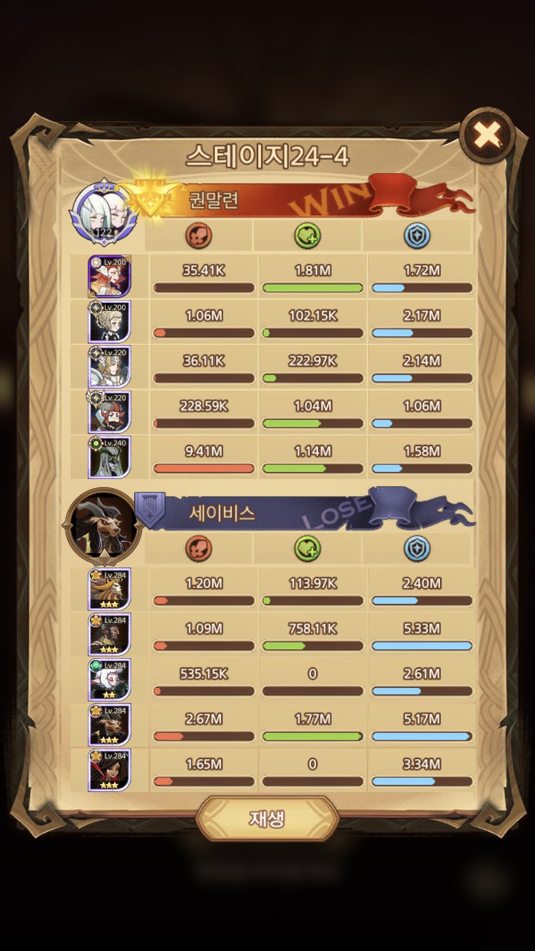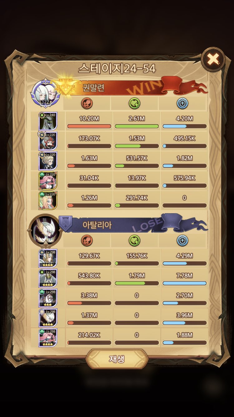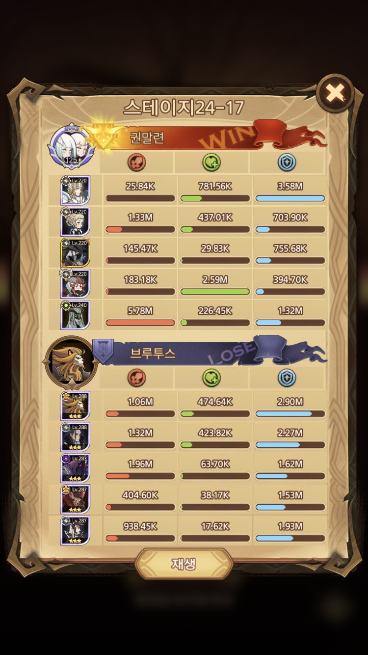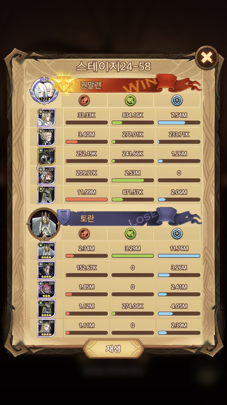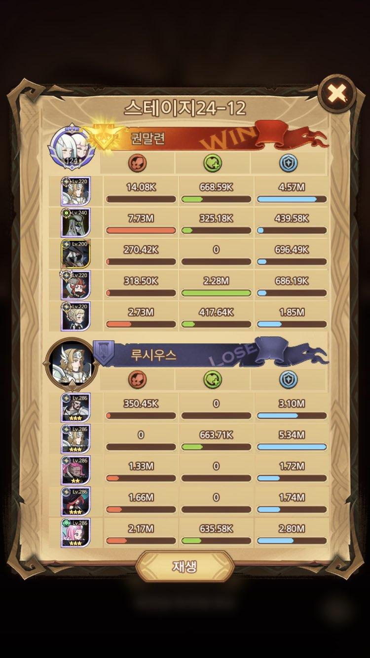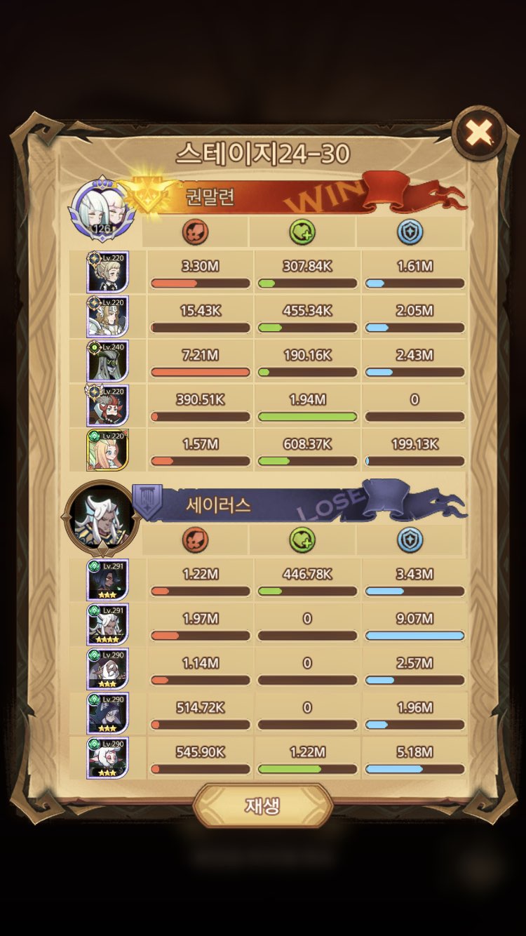 24-60 : 24 챕터의 마지막 스테이지답게 상당히 어렵습니다. 아탈리아와 세인, 타시의 침묵 때문에 세미라는 에너지를 못 채우고 로젤린은 녹고 루시우스는 버틸 수가 없어서 결국 토란덱으로 클리어했습니다. 토란 갑옷만 벗기고 호각을 착용했습니다. 그리고 무한 반복하다 보면 운 좋게 한방에 클리어할 수 있습니다. 토란 레전드 220으로도 충분히 깰 수 있습니다. 신화였다면 더 빨리 깨지 않았을까 싶네요. 오토 끄고 시작하다가 세미라가 침묵이 풀리고 죽으면 오토 켜고 토란궁으로 마무리합니다. 레인 혼자 남을 경우도 있는데 토란과 1:1에서 이기길 바래야 합니다. 아래 클리어 영상 참고하세요.