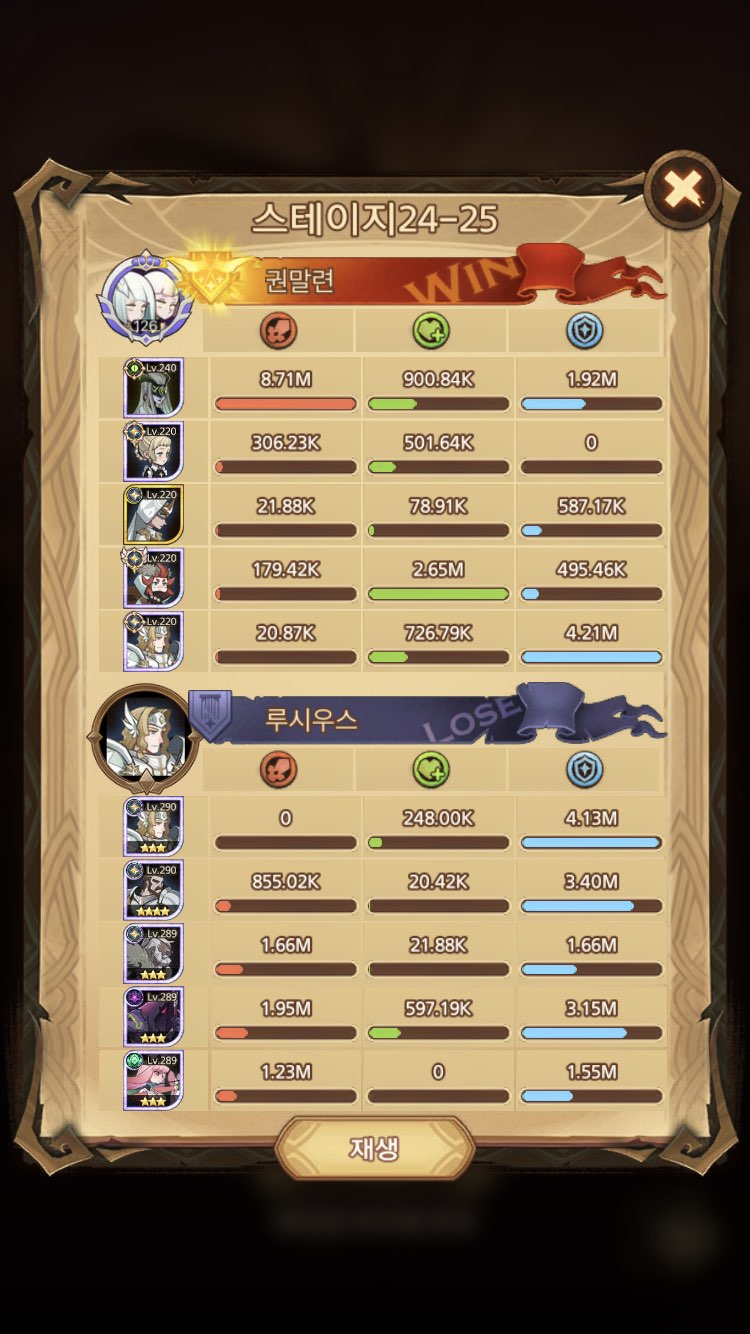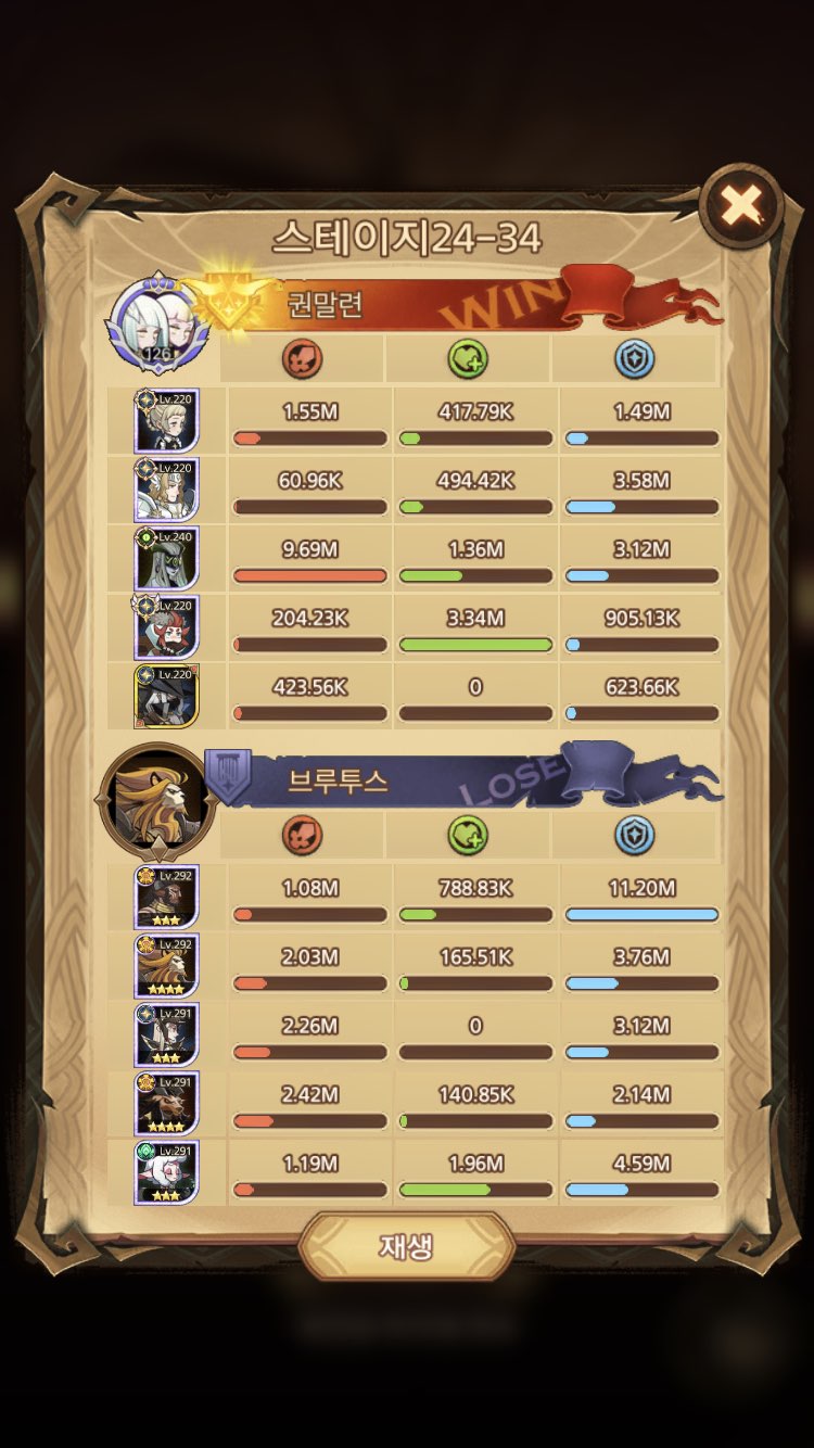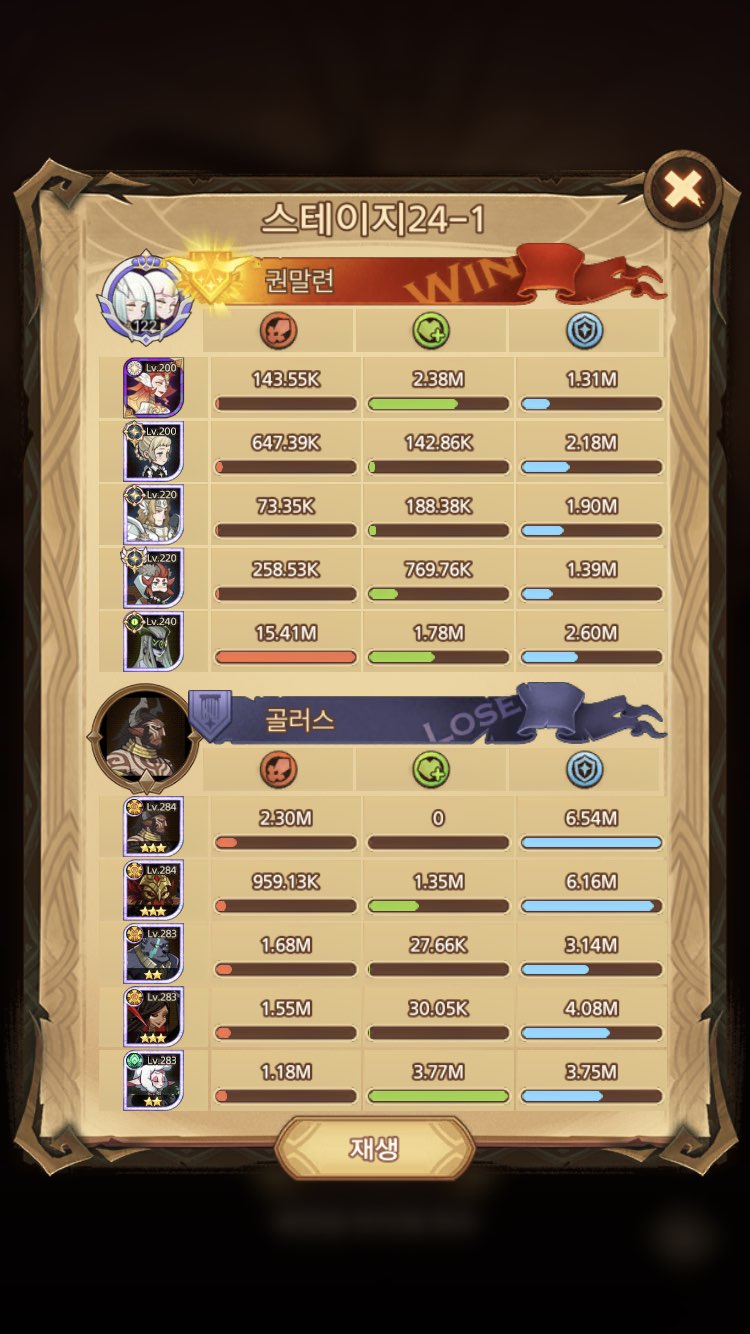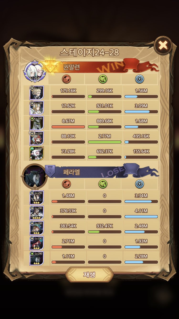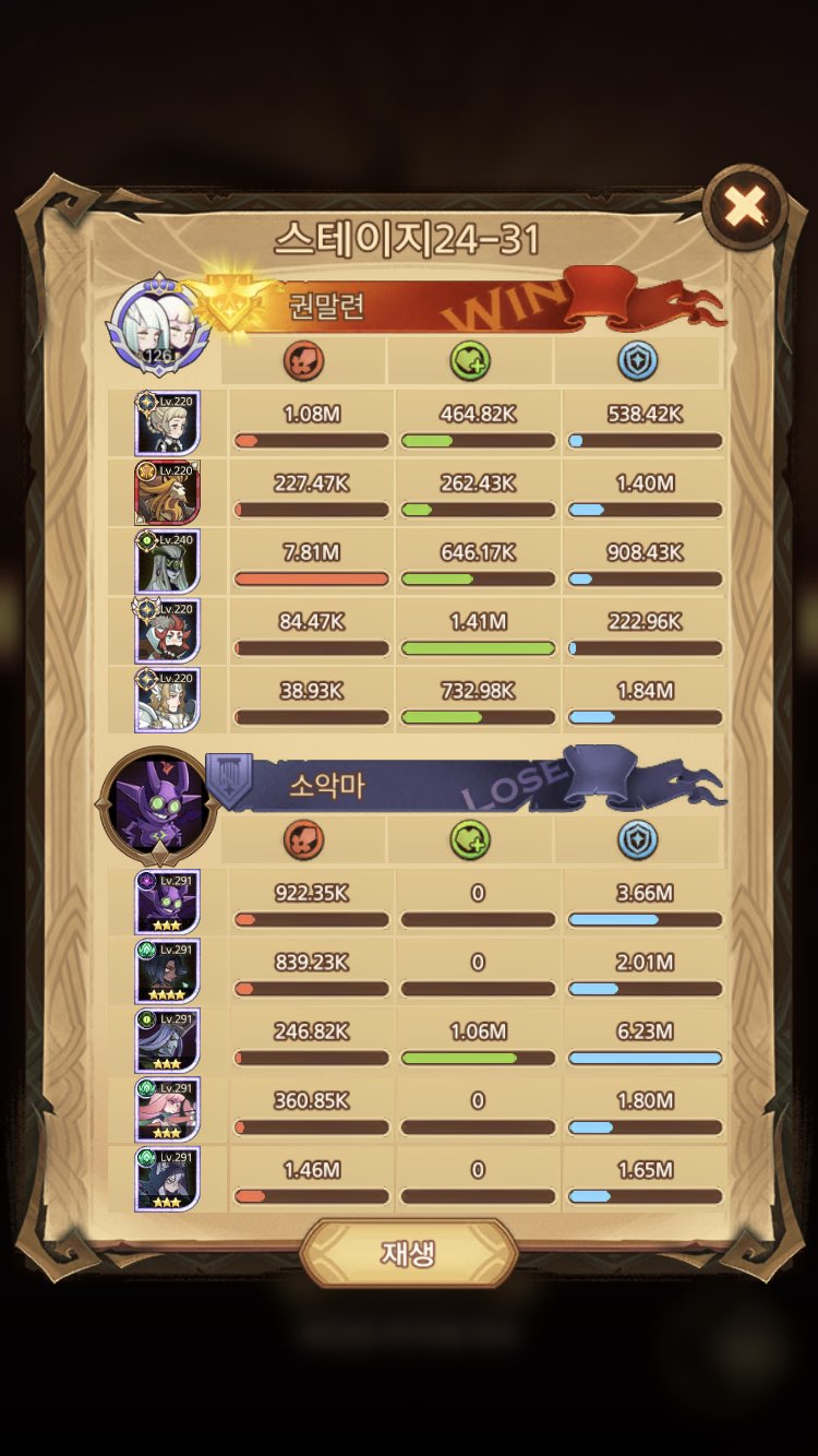 24-60 : 24 챕터의 마지막 스테이지답게 상당히 어렵습니다. 아탈리아와 세인, 타시의 침묵 때문에 세미라는 에너지를 못 채우고 로젤린은 녹고 루시우스는 버틸 수가 없어서 결국 토란덱으로 클리어했습니다. 토란 갑옷만 벗기고 호각을 착용했습니다. 그리고 무한 반복하다 보면 운 좋게 한방에 클리어할 수 있습니다. 토란 레전드 220으로도 충분히 깰 수 있습니다. 신화였다면 더 빨리 깨지 않았을까 싶네요. 오토 끄고 시작하다가 세미라가 침묵이 풀리고 죽으면 오토 켜고 토란궁으로 마무리합니다. 레인 혼자 남을 경우도 있는데 토란과 1:1에서 이기길 바래야 합니다. 아래 클리어 영상 참고하세요.