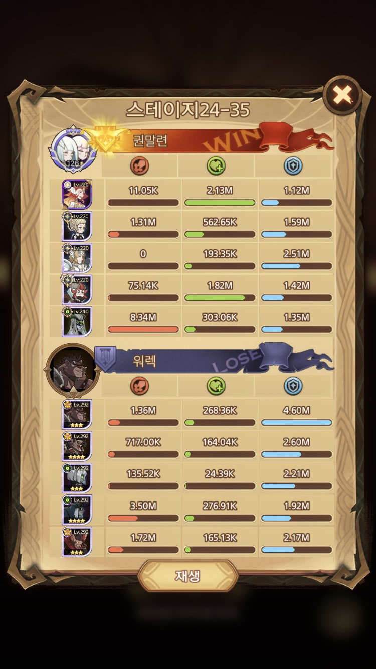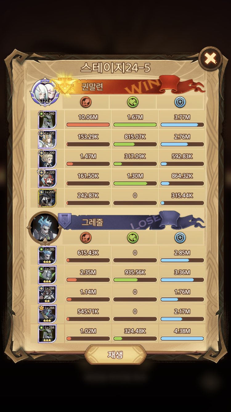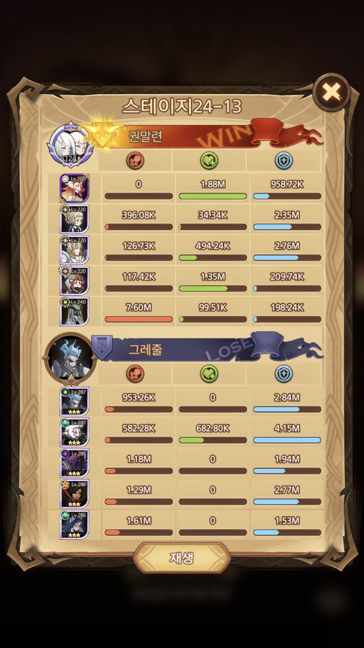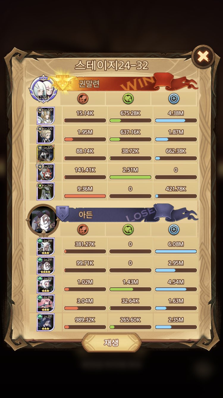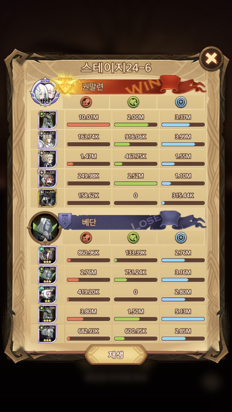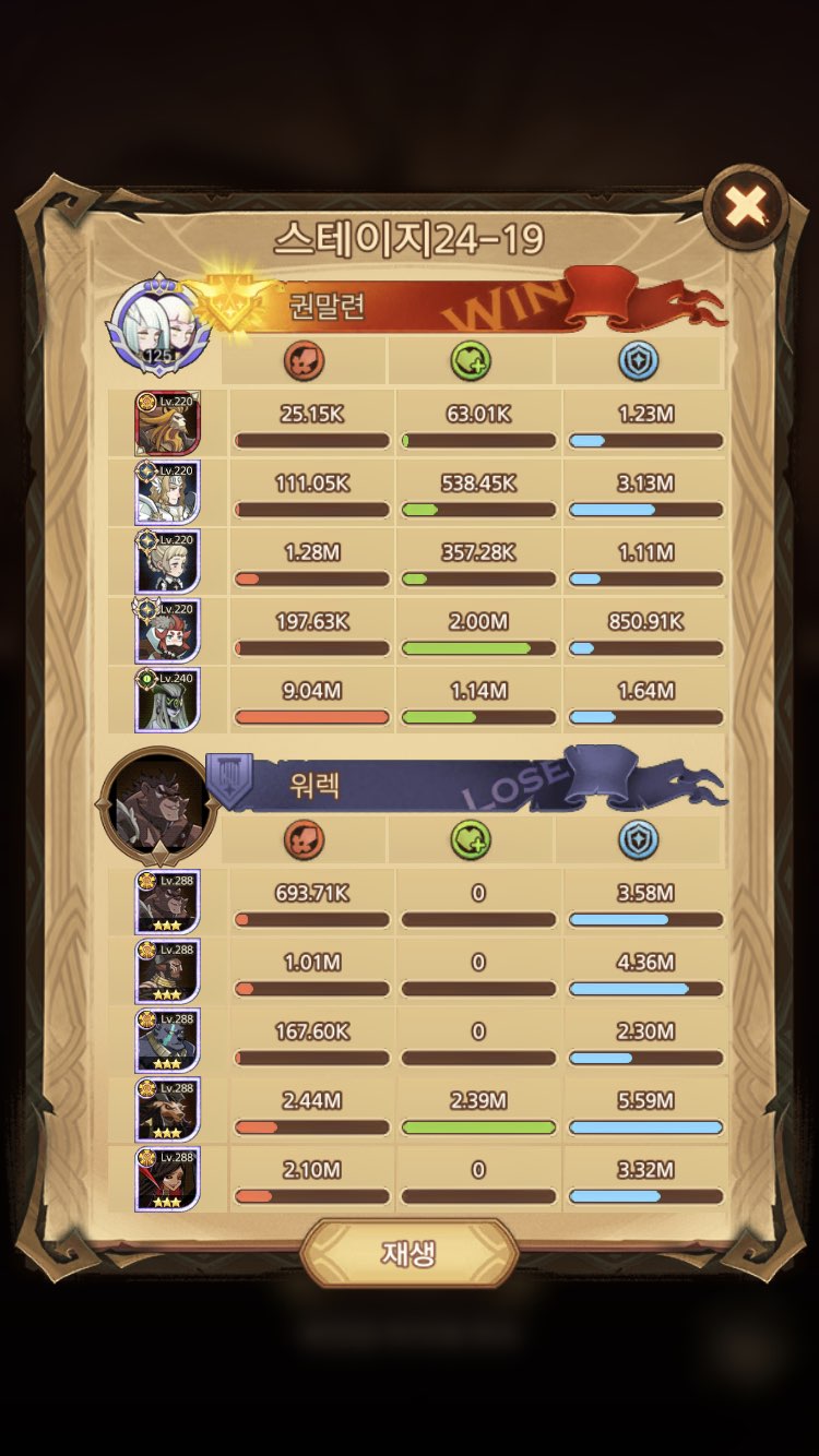 24-60 : 24 챕터의 마지막 스테이지답게 상당히 어렵습니다. 아탈리아와 세인, 타시의 침묵 때문에 세미라는 에너지를 못 채우고 로젤린은 녹고 루시우스는 버틸 수가 없어서 결국 토란덱으로 클리어했습니다. 토란 갑옷만 벗기고 호각을 착용했습니다. 그리고 무한 반복하다 보면 운 좋게 한방에 클리어할 수 있습니다. 토란 레전드 220으로도 충분히 깰 수 있습니다. 신화였다면 더 빨리 깨지 않았을까 싶네요. 오토 끄고 시작하다가 세미라가 침묵이 풀리고 죽으면 오토 켜고 토란궁으로 마무리합니다. 레인 혼자 남을 경우도 있는데 토란과 1:1에서 이기길 바래야 합니다. 아래 클리어 영상 참고하세요.