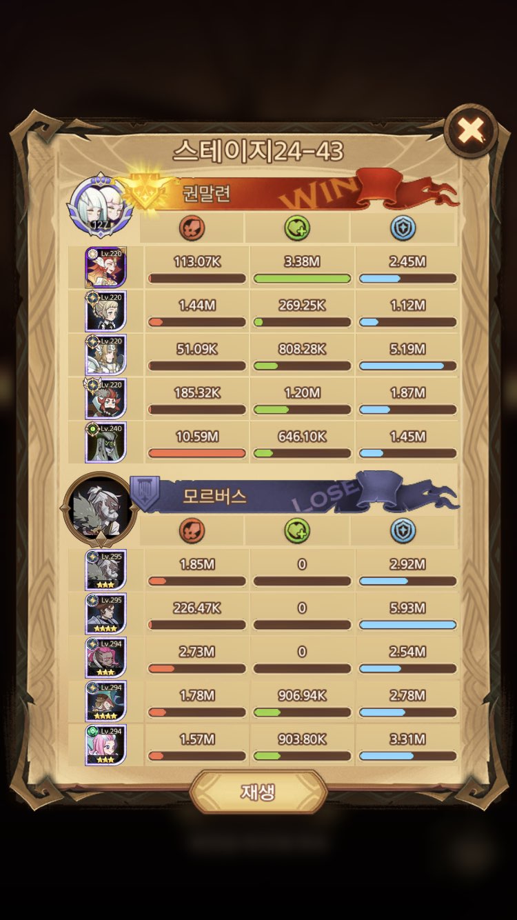 24-56 : 24 챕터 들어와서 가장 많이 리트한 구간이 아닐까 싶습니다. 시작하자마자 포크스, 로젤린, 루시우스가 죽는 경우가 많습니다. 한 명이라도 죽으면 리트해줍니다. 운 좋게 살아서 토란이 살아있는 경우가 있는데 토란치즈를 역으로 당하는 경우도 많았습니다. 무한 리트해서 클리어했습니다.