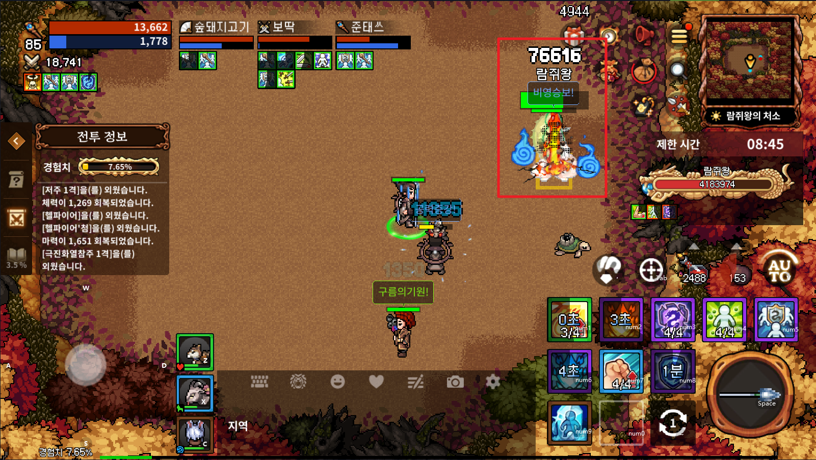 람쥐왕이 번개 스킬을 쓸 때는 가장 밑으로 내려가 있으면 맞지 않습니다.