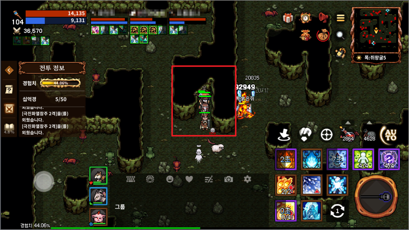 폭:쥐왕굴에서 가장 인기 있는 곳이 바로 폭:쥐왕굴5인데요. 입구 바로 앞에 움푹 파인 곳이 있어서 전사나, 도적이 앞을 막아주고 뒤에 도사와 술사가 원거리로 폭쥐를 잡아주면 안정적으로 플레이할 수 있습니다. 간혹 가는 길에 죽었다면 성황당을 가지 말고 폭쥐5 패인 곳까지 들어가서 도사가 다 살려주면 됩니다. 자리 잡고 있는 그룹이 많으니 채널을 변경하면서 빠르게 선점해야 합니다.