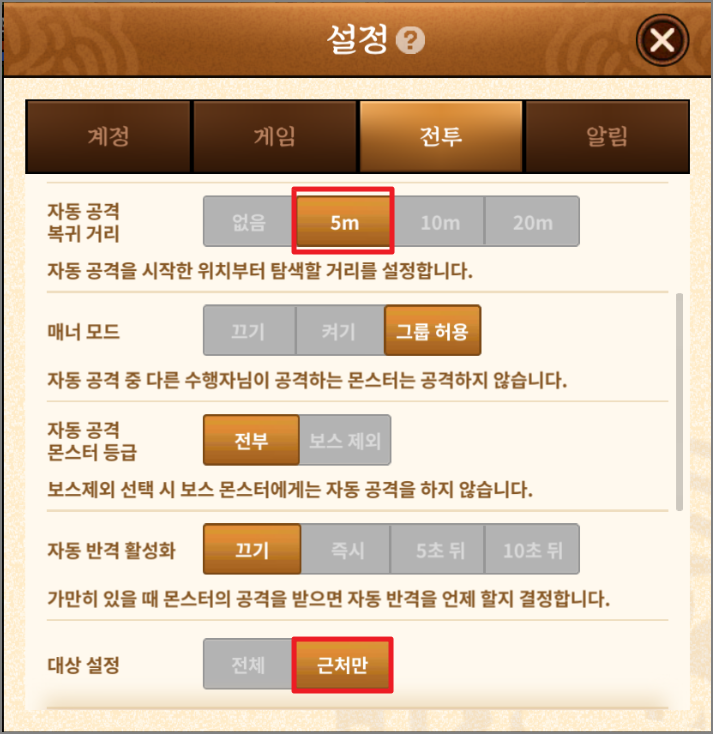 1. 공격의 핵심인 주술사는 먼저 게임 설정 > 전투에서 자동 공격 복귀 거리 5m와 대상 설정 근처만으로 설정해줍니다.
