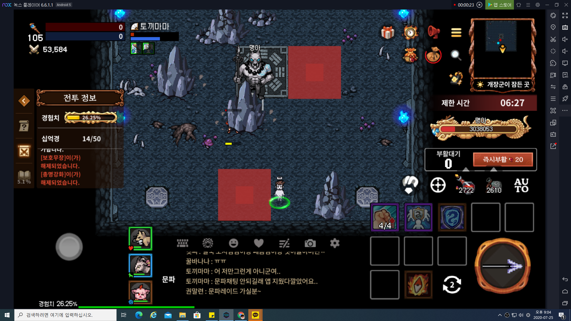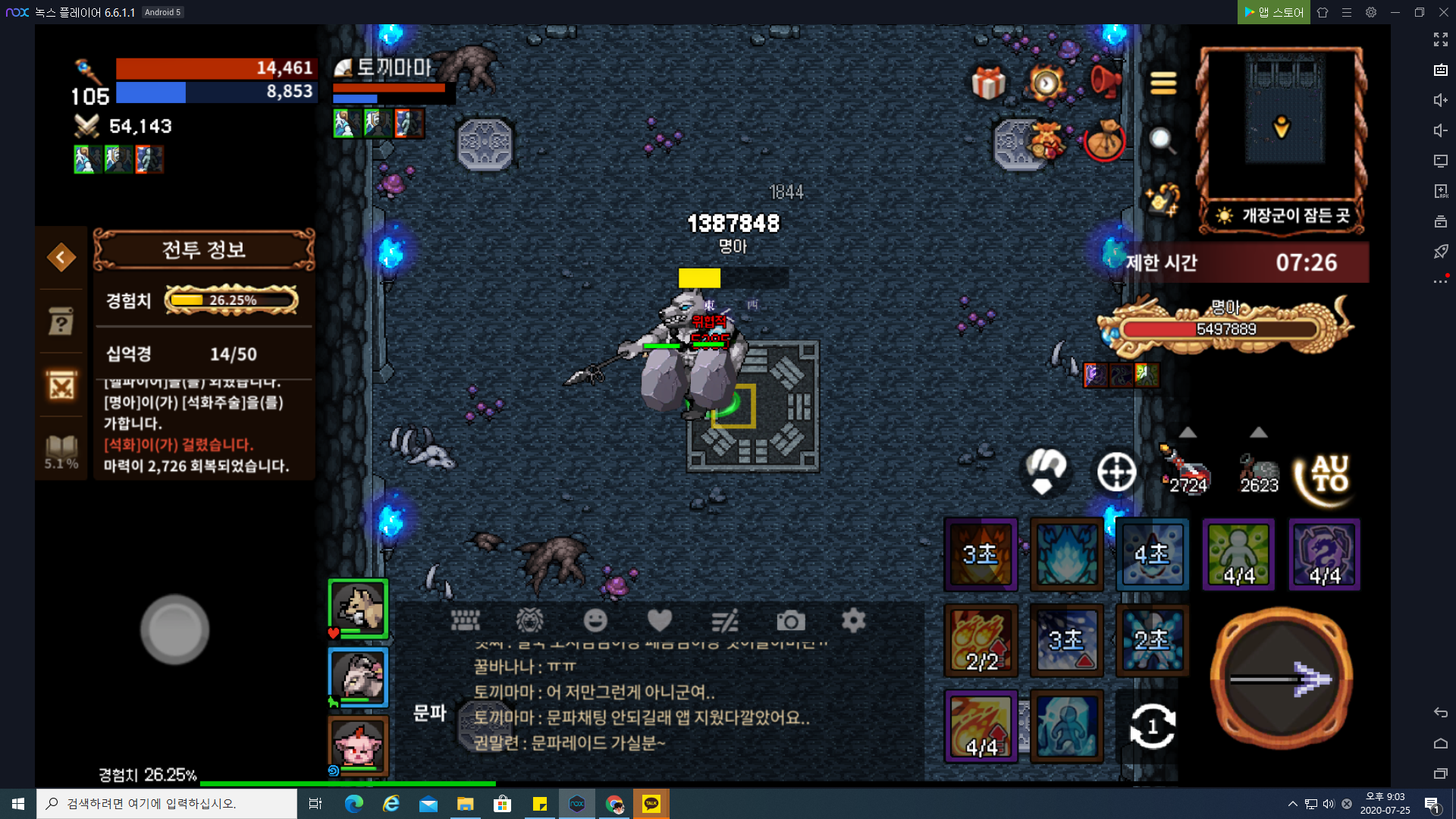 위 이미지가 체력 25%에 시전하는 스킬을 막지 못했을 때입니다. 위에서 떨어지는 돌떵이가 굉장히 아픕니다. 스킬도 굉장히 오래 쓰기 때문에 만약에 죽었다면 스킬이 끝난 후에 부활하시기 바랍니다.
