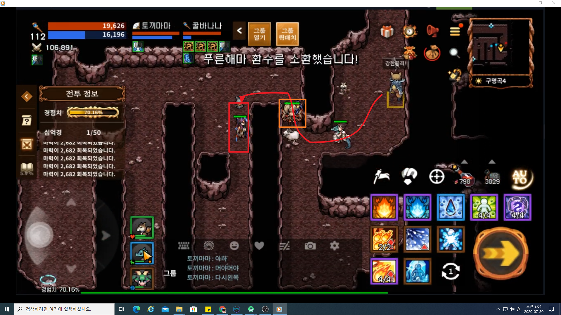 1. 이미지에 보이는 주황색 네모 표시가 된 부분에 한명이 서있어야 합니다. 그리고 팀원 중 한명이 개왕을 한대 치고 붉은색 네모 표시 된 곳으로 이동 후 공격하시면 됩니다. 이 때 개왕을 친 팀원은 개왕한테 맞지 않고 빠르게 붉은색 위치고 이동해야 합니다. 개왕이 쓰는 스킬을 맞으면 한방에 죽을 수 있습니다. 그리고 길목을 차단하고 있는 팀원은 개왕을 치지 말고 가만히 서있으면 됩니다.
