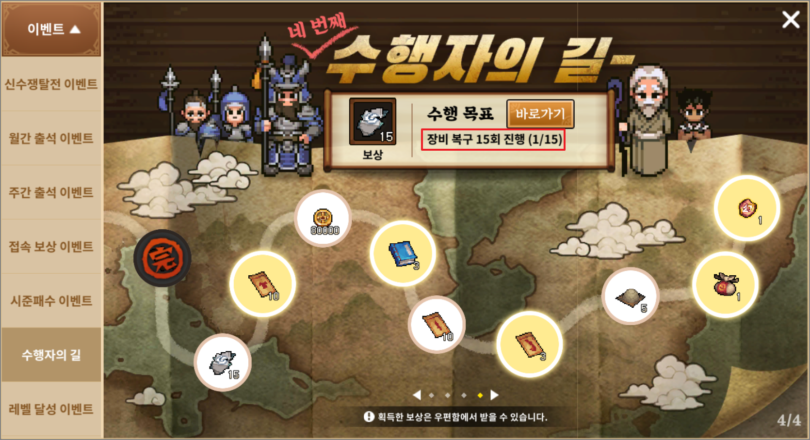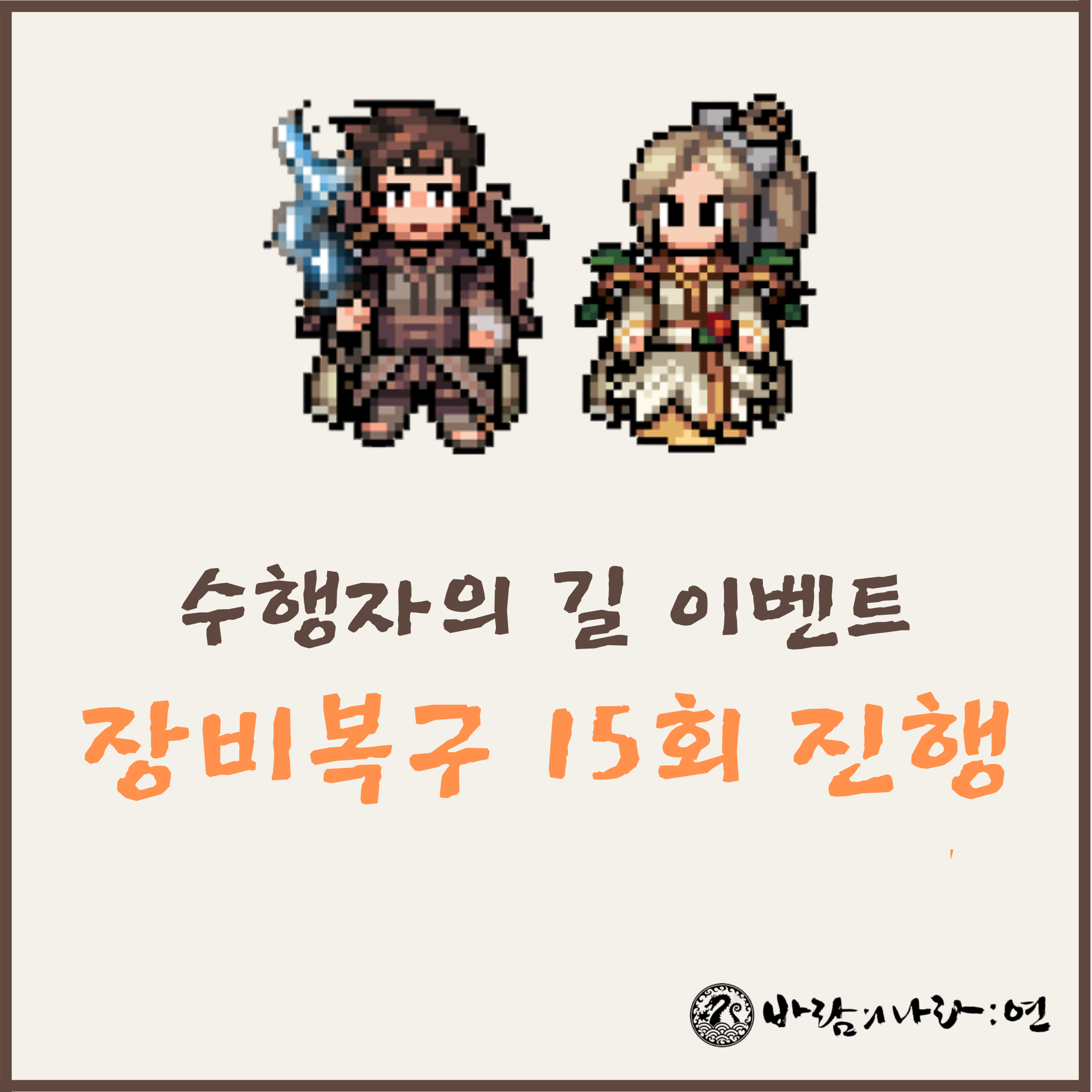 안녕하세요. 토끼파파입니다. 오늘은 수행자의 길 이벤트 중 수행목표 장비 복구 15회 진행하는 방법에 대해서 알려드립니다. 아마 여기서 막히는 분들이 많을 텐데요. 먼저 장비 복구라는 개념부터 설명드릴게요.