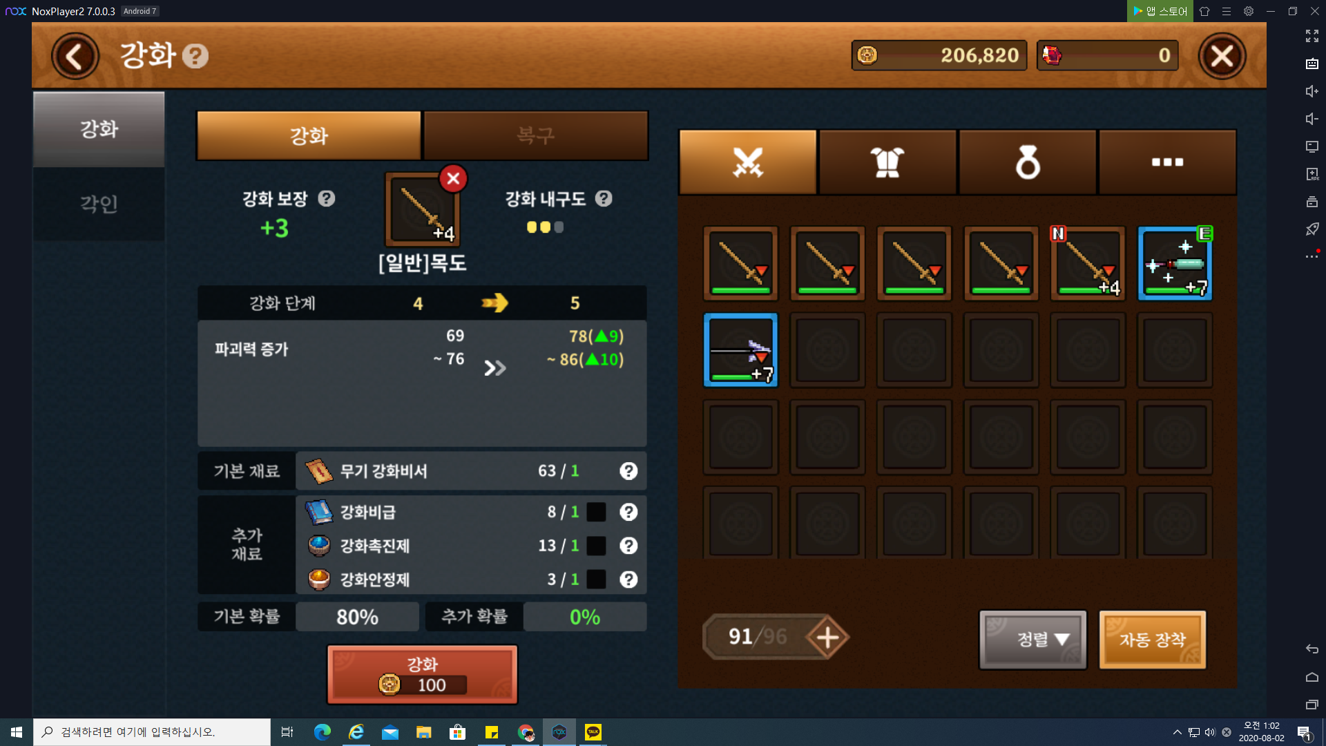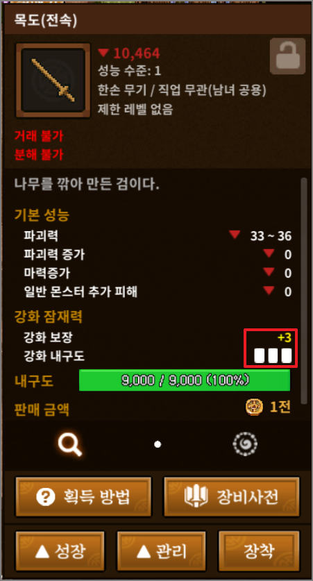 구입한 목도 중에 강화 보장과 강화 내구도가 가장 낮은 목도로 진행해야 합니다. 목도를 여러개 구입한 결과 강화 보장+3과 내구도 3칸짜리가 가장 낮았습니다. 목도는 성능이 가장 낮은 무기라 강화 비용과 강화 비서가 적게 들어가서 부담 없이 진행할 수 있습니다. 빨리 실패해서 강화 내구도를 소진시켜야 그나마 비용과 강화 비서 소모를 줄일 수 있습니다.