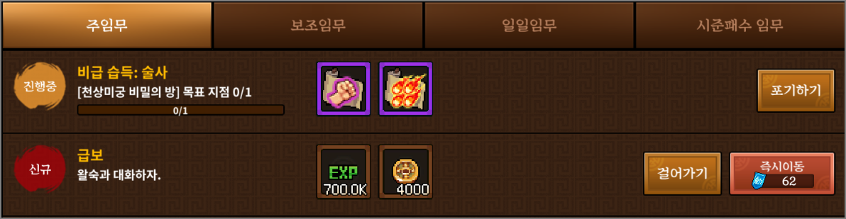 5. 승급 후 생기는 비급 습득이라는 퀘스트를 완료하면 승급 기술을 배울 수 있습니다. 기술메뉴에 가면 가장 중요한 승급 기술 2가지가 생겨난 걸 확인할 수 있고 승급 기술을 배우는 방법은 아래 포스팅을 확인하세요.