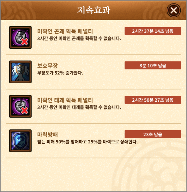 또, 미확인 괘를 획득했다면 3시간 동안 같은 괘를 먹을 수 없는 패널티를 받게 됩니다. 왕굴 어딘가로 이동하기 전에 버프 화면을 통해 획득 페널티를 받고 있는지 확인하고 이동하세요. 9월4일 패치로 인해 3시간에서 1시간으로 패널티 시간이 줄었습니다.
