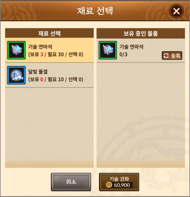 참고로 극의화열참주'첨의 2단계 상승에 필요한 재료입니다. 기술 연마석 30개와 달빛 물결 10개가 필요합니다. 기술 연마석과 달빛 물결은 산적굴에서 획득 가능한데 드랍률이 상당히 낮은 것 같습니다. 2일 동안 자동사냥을 하고 있는데 기술 연마석만 3개 먹었네요. 달빛 물결은 구경도 못했습니다. 기술 단계 상승시키는 건 시간싸움일 것 같습니다.