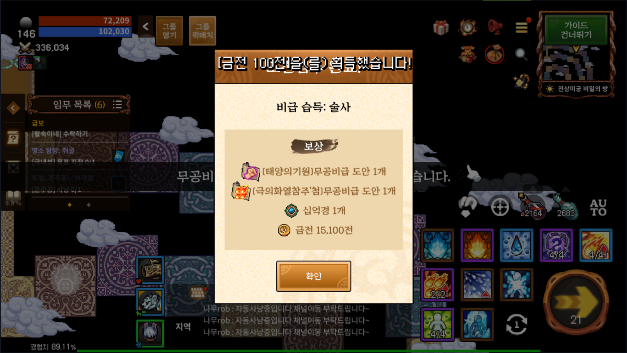 목표지점은 저의 경우 가장 외곽에 있는 길 1시 방향에 있었습니다. 퀘스트를 완료하면 승급 기술 도안과 십억경 1개를 획득할 수 있습니다. 퀘스트를 완료하면 승급 기술을 배울 수 있도록 안내하는 가이드를 자동으로 실행됩니다.