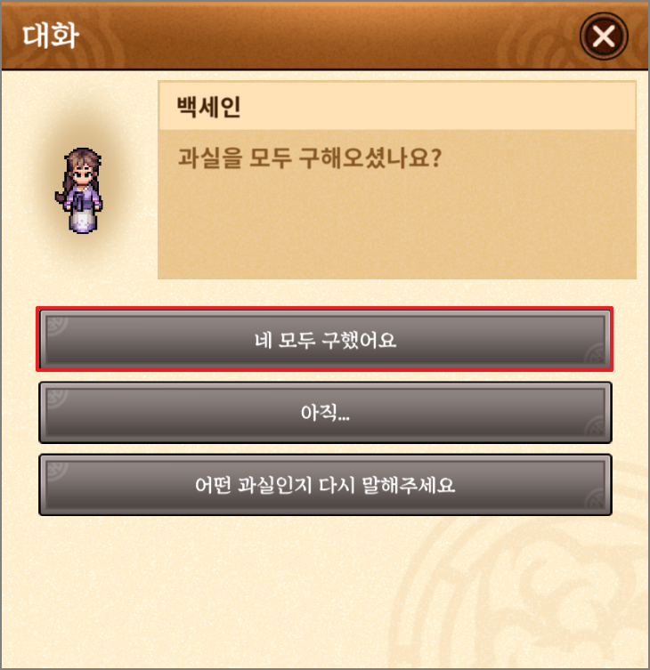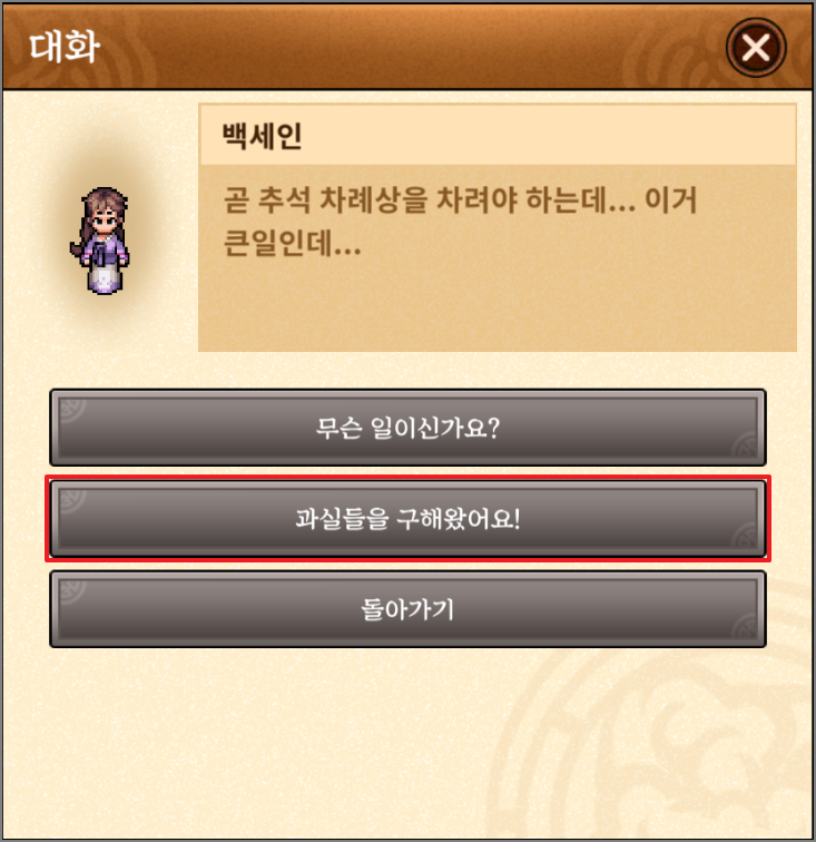구매한 재료를 가을풍물장수에게 갖다 주면 포장된 과실을 주는 데 사용을 하면 랜덤으로 과실을 줍니다.