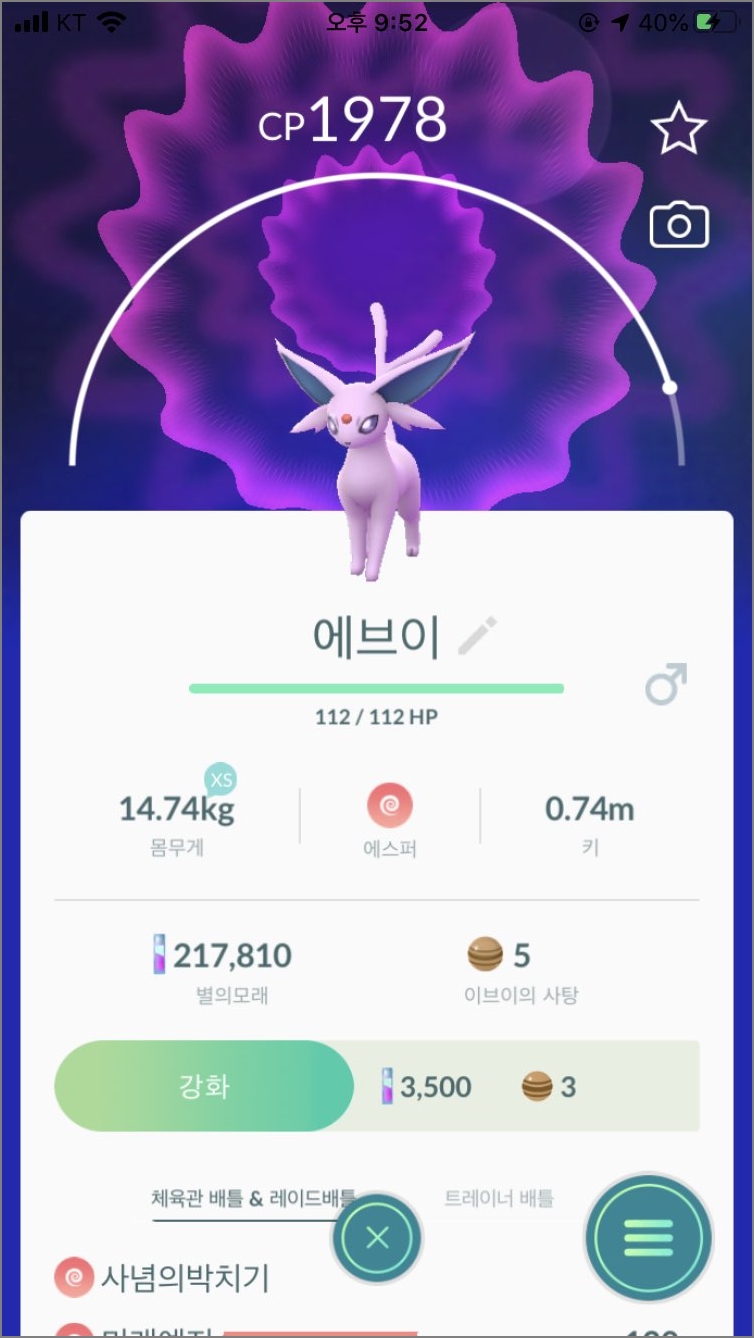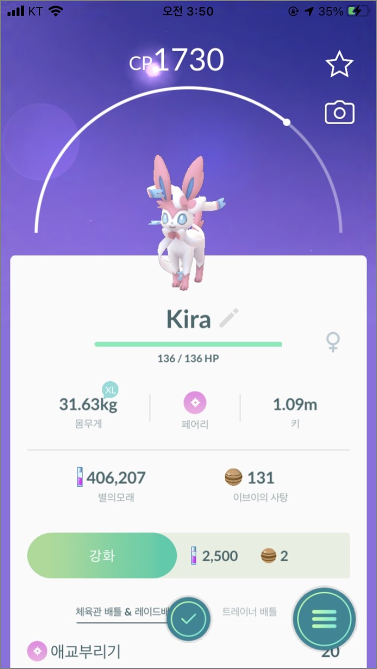 드디어 이브이로 진화 가능한 마지막 포켓몬인 페어리 타입 님피아까지 진화 가능하게 되었습니다.