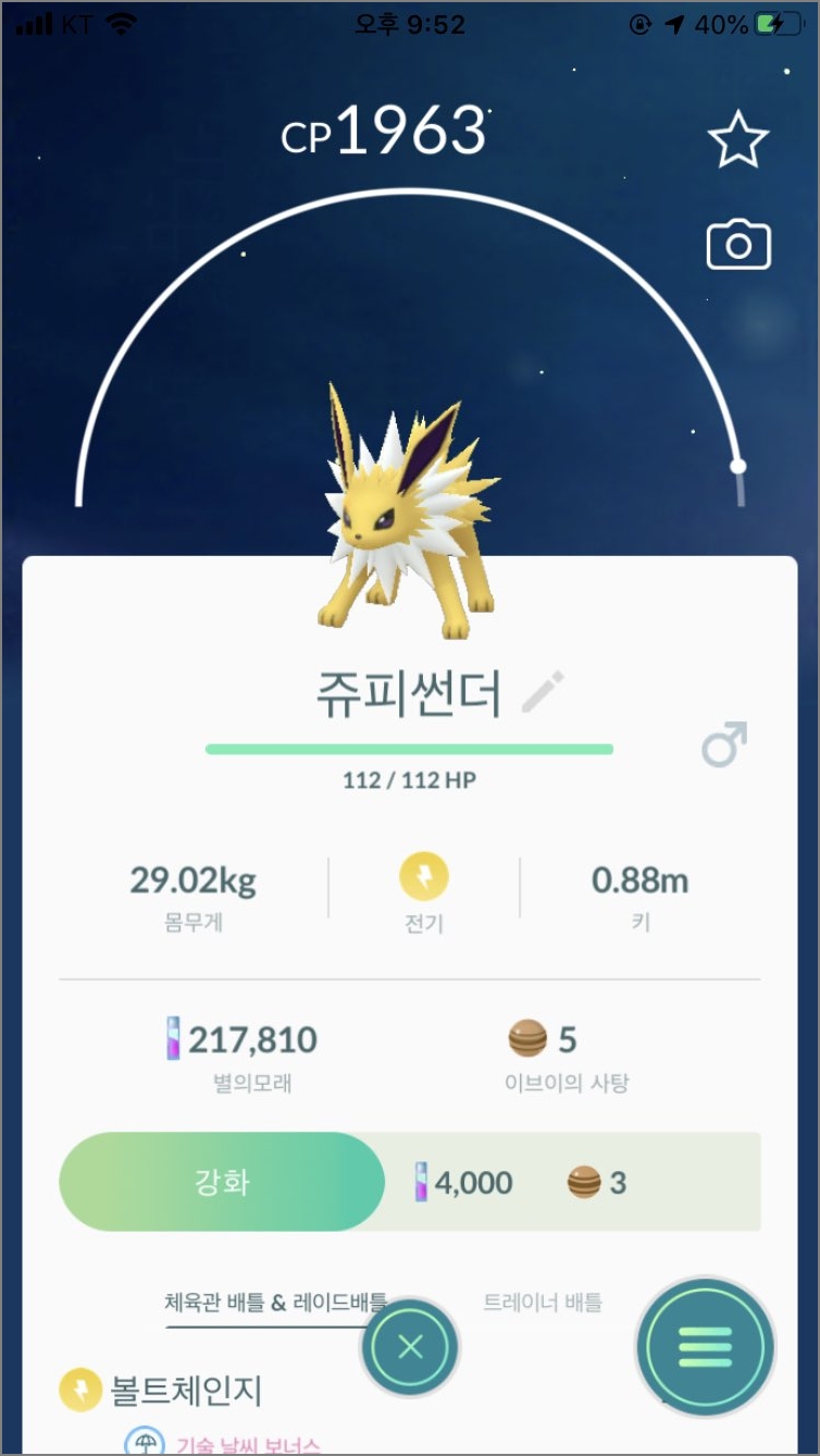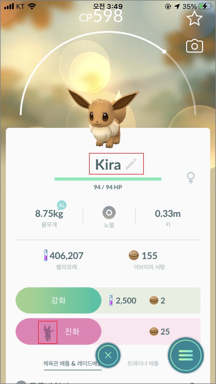 짜잔! 에브이로 바로 진화가 되네요. 이것도 모르고 계속 진화 버튼을 눌렀다가 쥬피썬더만 3마리 먹었습니다. 이제 글레이시아, 리피아, 블래키만 진화시키는 일만 남았네요. 이 방법 말고도 다른 방법도 있다고 하는데 이브이 잡아서 사탕만 25개 모으면 되기 때문에 이 방법이 가장 쉬운 것 같습니다.