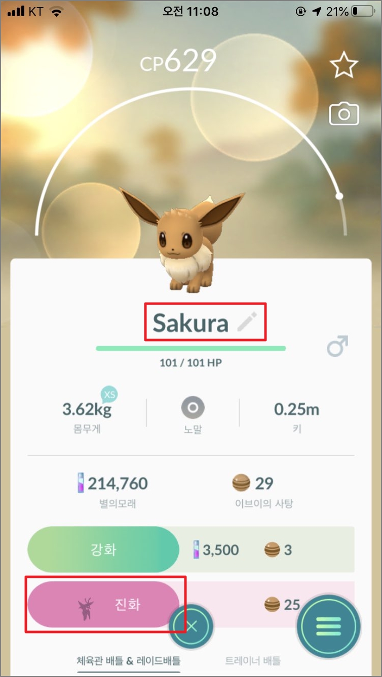 오른쪽 이미지처럼 닉네임을 진화하고자 하는 몬스터의 영어 이름으로 변경하면 진화 버튼의 색이 핑크로 변하며 물음표가 몬스터의 모습으로 바뀌게 됩니다. 저는 에브이를 갖고 싶어서 닉네임을 Sakura로 변경하고 진화했습니다. 대소문자는 구분하지 않는 것 같습니다.