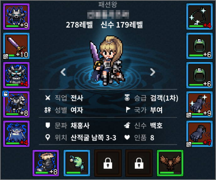 무기 : (예리한) 금강무기, (예리한) 도깨비방망이를 차고 있습니다. 깨비는 참고로 파괴력증가와 체마회복향상% 이 붙어있습니다. 335짜리 무기라 어마어마합니다. 무려 11강이네요.