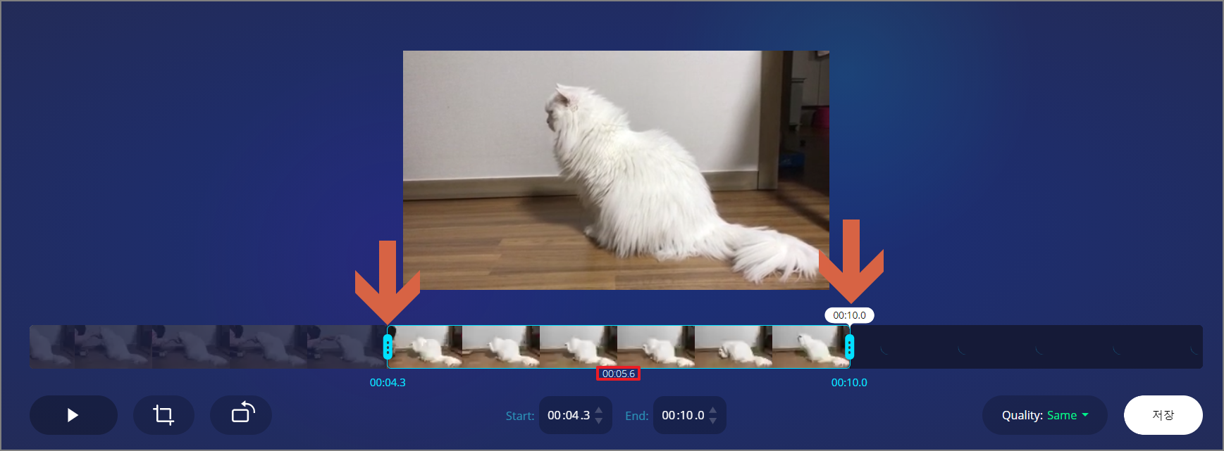 영상을 불러온 화면입니다. 왼쪽 하단에 재생 버튼이 있고 화살표로 표시한 부분을 드래그하면서 영상 길이를 조절할 수 있습니다. 앞에서 자르든 뒤에서 자르는 게 가능합니다. 가운데 빨간색 네모 표시는 총 영상 길이를 초수로 표시해 줍니다.