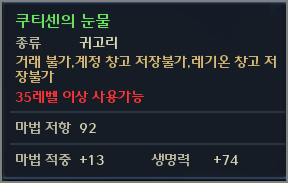 쿠티센은 악세를 먹기 위해서 잡습니다. 쿠티센의 귀고리랑 쿠티센의 눈물을 얻을 수 있어요. 귀고리는 격수용, 눈물은 법사용이네요.