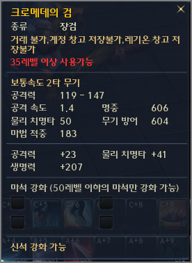 크로메데는 누구나 알다시피 무기를 줍니다. 크로메데의 창 같은 경우는 현재 키나 시세로 150을 넘는 금액으로 팔리더라고요. 그만큼 나오는 확률도 적고 옵션이 좋아서 인기가 많은가 봅니다. 하루에 한 3번은 가는데 크로메데 무기 구경만 해도 운수 좋은 날입니다. 정말 보기 힘든 것 같네요.