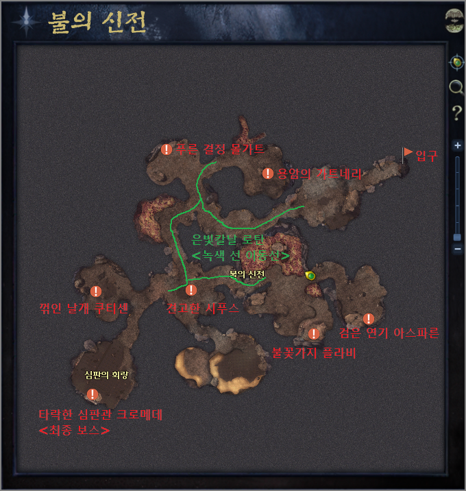 불의 신전은 최종 보스인 크로메데까지 가기 전에 용암, 로밍형 네임드 로탄, 시푸스, 쿠티센, 검은 연기 아스파른과 같은 중간 보스급 몹이 있습니다. 이 외에도 플라비, 몰가트라는 몹이 있지만 크로메데로 가는 길목에 있는 보스를 제외하고는 잡지않는 경우가 많습니다.