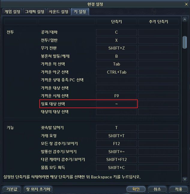 환경설정 > 키 설정에 전투 쪽을 보시면 징표 대상 선택이 있는데 저는 Tab키 바로 위에 "~"로 설정했습니다. 필드에서는 탭키를 이용해서 몹을 잡고 인던 갈 때는 징표 대상 선택으로 하면 애드가 날 경우가 줄어듭니다.