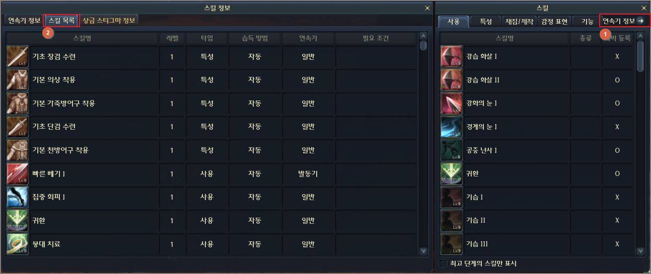 스킬창(K)을 엽니다. 우측 연속기 정보를 클릭하고 스킬 목록을 클릭하세요. 레벨별로 어떤 스킬을 배울 수 있는지 확인할 수 있습니다.