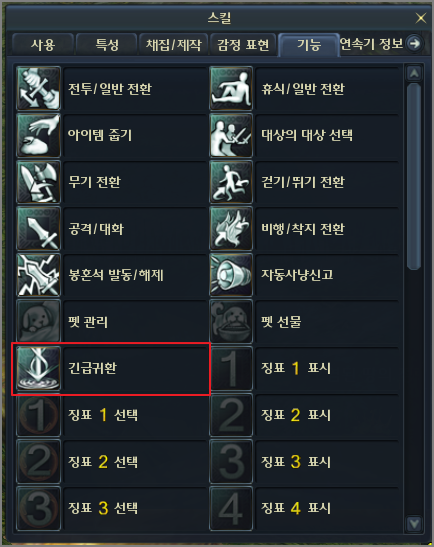 스킬 창(K)을 열고 기능 텝을 클릭합니다. 그럼 긴급귀환이라고 있는데 귀환을 급하게 쓸 때 사용하세요. 본래 취지는 케릭터가 오브젝트에 끼여서 나오지 못할 때 사용하라고 권장하고 있습니다.