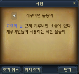 케루비언 소굴 가운데에 물동이가 있습니다. 클릭하면 인벤토리 창으로 들어오게 됩니다. 이 물동이로 오염되지 않은 물을 떠야하는데요. 수원지 폭포 아래 있다는 정보를 줍니다. 참고로 케루비언 소굴은 여러군데 있습니다. 물동이도 마찬가지로 소굴마다 있어요.