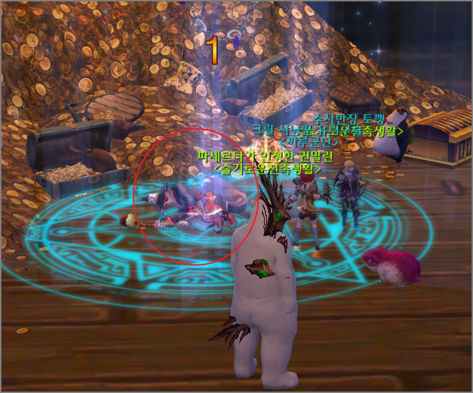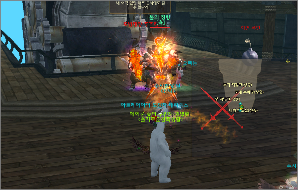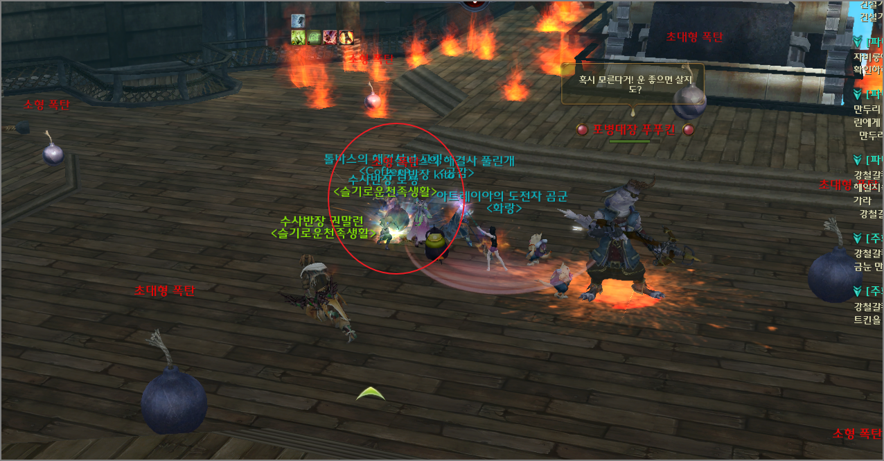 다음 상층 중간보스인 포병대장 푸푸킨입니다. 여러개의 폭탄이 나오는데 이 중에 푸푸킨 옆에 있는소형 폭탄을 빠르게 터뜨리고 소형 폭탄이 터진 자리에 모두 모입니다. 폭탄을 설치하면 푸푸킨은 무적 상태가 되기 때문에 딜을 잠시 멈추세요. 그리고 나머지 폭탄이 다 터질 때까지 기다렸다가 다시 딜을 하면 됩니다. 이때 원딜과 힐러는 푸푸킨과 떨어져서 공격과 힐을 해야 합니다. 범위 공격을 하기 때문이죠. 이 패턴만 계속 반복되기 때문에 한 번만 숙지하면 쉽게 깰 수 있습니다.
