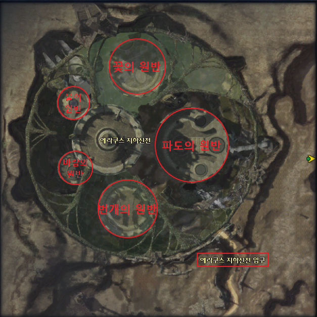 다음으로 복구 미션인데요. 여기 또한 각 원반을 돌아다니면서 석벽을 복구해 주시면 됩니다. 위의 에라 쿠스 지하 신전 맵의 각 원반 위치만 알면 쉽게 클리어할 수 있습니다. 단, 정예 몹이기 때문에 레벨이 낮다면 파티를 구해서 미션을 진행하시면 편합니다.