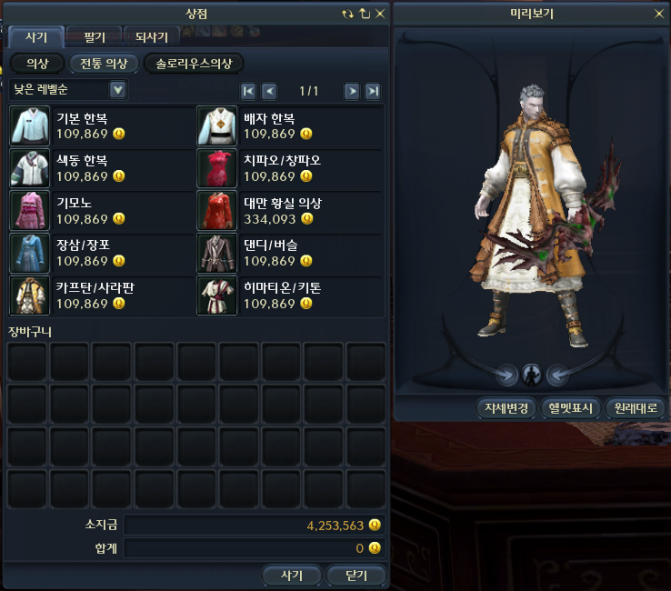 클릭하면 의상, 전통 의상, 솔로리우스의상 3개 텝이 존재합니다. 저는 전통 의상에서 카프탄/사라판을 구매했습니다. 여기서 아이템에 마우스를 갖다대고 ctrl+좌클릭을 하면 미리보기로 입어 볼 수 있습니다. 겨울이라 좀 따듯해 보이는 옷으로 샀어요.