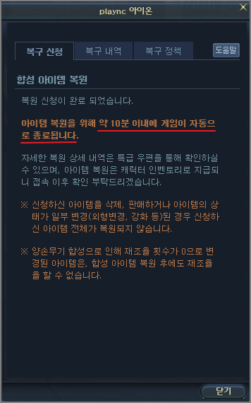 복원 신청이 완료되었고 10분 이내에 게임이 자동으로 종료된다는 문구가 보입니다. 실제로 한 3분정도 지난 후 게임이 자동으로 종료되었습니다. 다시 접속을 하고 게임에 들어갑니다.