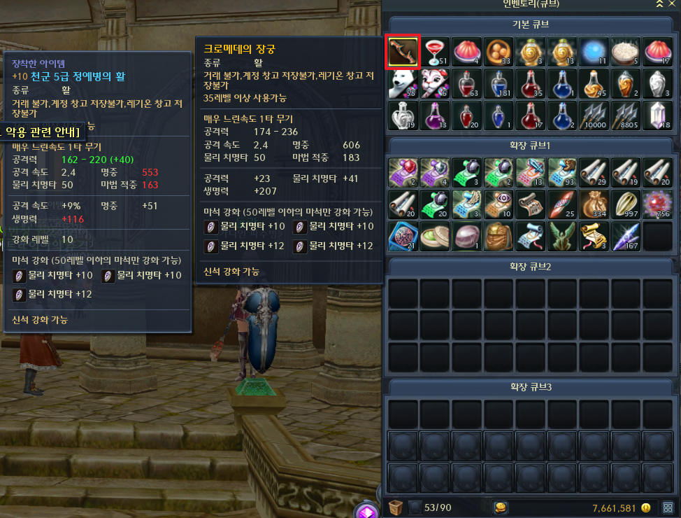 게임 접속 후 인벤토리를 열어보니 천군 5급 정예병의 활은 장비 착용이 되어 있었고 크로메데 무기가 큐브에 들어와 있었습니다. 정말 그대로 복원이 되었습니다.