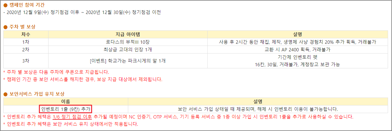 그리고 우리가 원하는 인벤토리 1줄 (9칸)을 보안 서비스를 꾸준히 유지했을 때 1월 6일 점검 이후에 받을 수 있습니다.