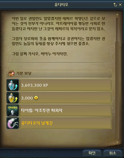 마지막으로 테미논요새 거점에 있는 유디티오에게 가면 완료하고 보상을 받을 수 있어요.