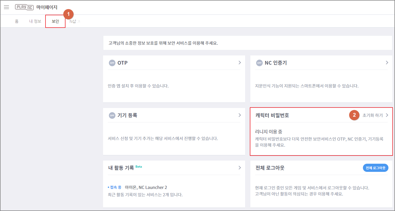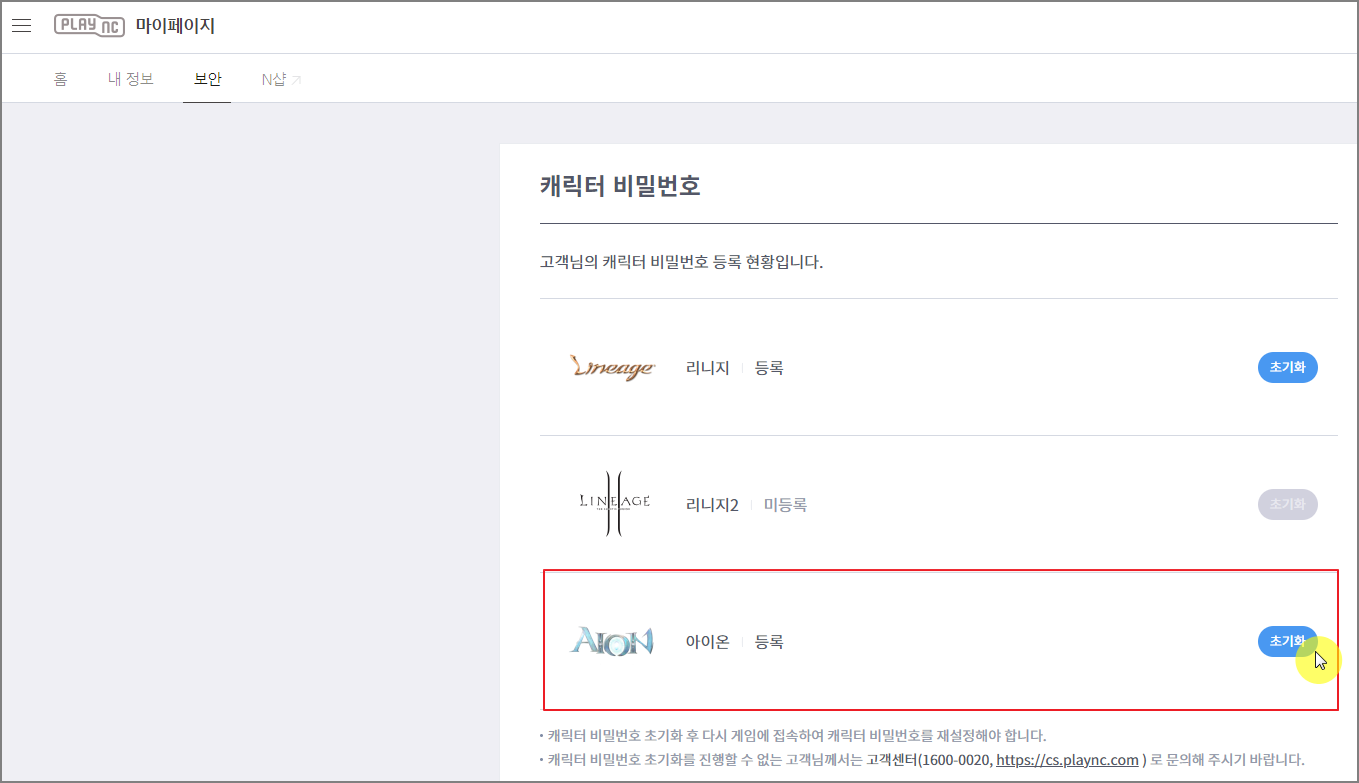좌측 상단 보안 탭에서 캐릭터 비밀번호 > 초기화 하기를 클릭합니다.