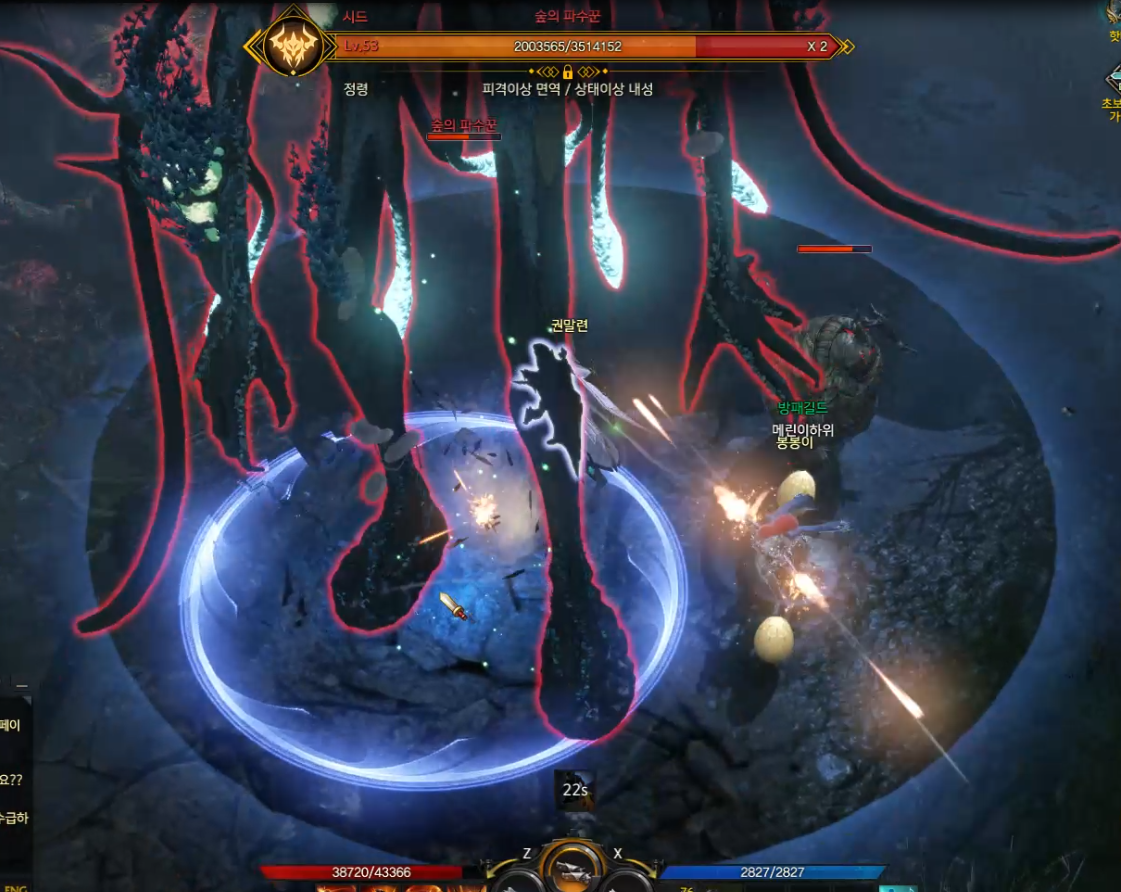 바로 이 기다란 몹이 숲의 파수꾼입니다. 리젠 시간이 빠르기 때문에 없다면 조금만 기다리면 나옵니다. 가깝게 붙어서 퀘스트 아이템 사용 버튼 F5 또는 F6을 누르고 숲의 파수꾼 발 쪽에 써주시면 됩니다.