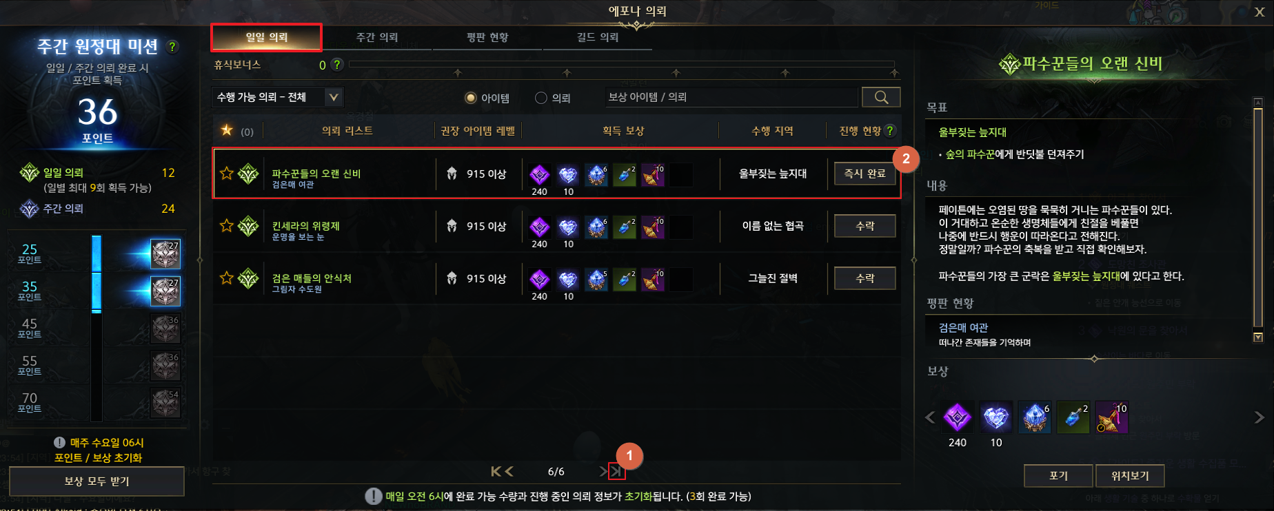 오늘은 로스트아크의 일일 숙제 중 하나인 에포나 의뢰 - 파수꾼들의 오랜 신비 하는 방법에 대해 알려드립니다. 에로나의뢰는 일일 3회 할 수 있는 퀘스트 형식인데요. 원정대 경험치와 각종 보상을 주기 때문에 매일 3회씩 해주시는 게 좋아요. 어렵지 않기 때문에 쉽고 빠르게 끝낼 수 있습니다. 에포나의뢰는 단축키 Alt + J 또는 하단 메뉴 모험 > 에포나의뢰를 클릭하면 됩니다.