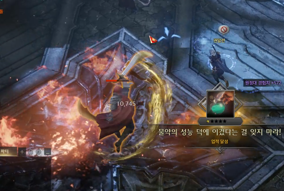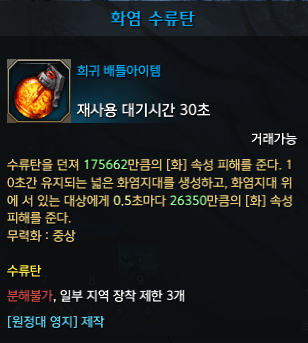 설명을 보면 알겠지만 10초간 유지되는 넓은 화염 지대를 생성하고 화 속성 피해를 지속적으로 주게 됩니다. 배틀 아이템은 사용이 가능하기 때문에 이것만 네임드에게 던지면 정말 쉽게 잡을 수 있습니다.
