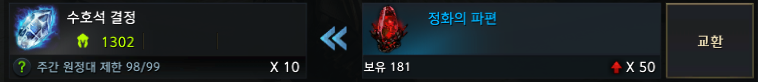 단, 처음에는 정화의 파편 20개가 들지만 교환을 하면 할수록 정화의 파편 개수도 늘어나게 됩니다.